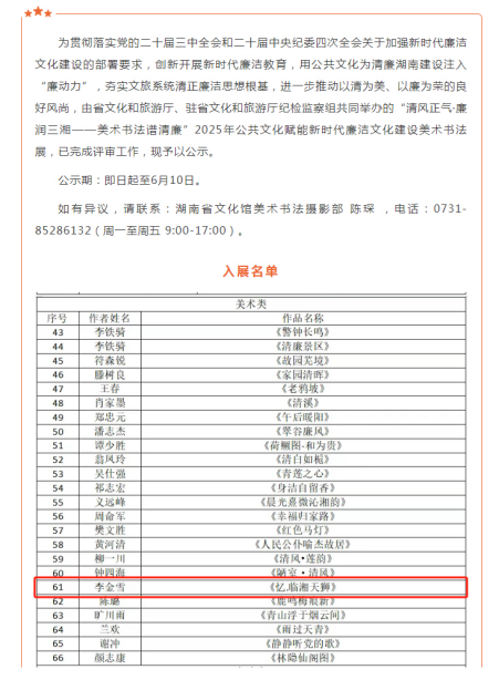 7月1日,“清風正氣·廉潤三湘”——2025年公共文化賦能新時代廉潔文化建設活動在長沙啟動,我館美術專干李金雪漆畫作品《憶·臨湘天獅》成功入選。此次展覽由湖南省文化和旅游廳、省紀委監委駐省文化和旅游廳紀檢監察組主辦,旨在創新開展新時代廉潔教育,以藝術形式推動廉潔文化深入人心,在全省營造以清為美、以廉為榮的良好風尚。