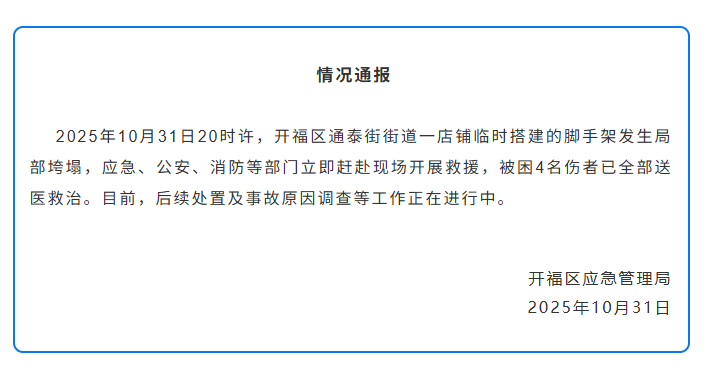 長(zhǎng)沙市開(kāi)福區(qū)應(yīng)急管理局通報(bào),2025年10月31日20時(shí)許,開(kāi)福區(qū)通泰街街道一店鋪臨時(shí)搭建的腳手架發(fā)生局部垮塌,應(yīng)急、公安、消防等部門(mén)立即趕赴現(xiàn)場(chǎng)開(kāi)展救援,被困4名傷者已全部送醫(yī)救治。目前,后續(xù)處置及事故原因調(diào)查等工作正在進(jìn)行中。(申智林)