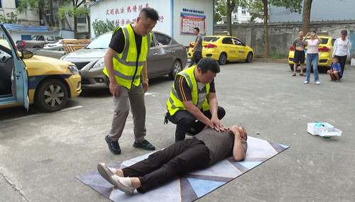 在大地飛鷹出租車公司,40余名出租車駕駛員在工作人員的指導下,模擬一輛轎車與出租車發(fā)生碰撞后導致車輛起火,駕駛員如何及時疏導乘客、搶救傷員、滅火自救并報警求救的應急處理全過程,達到“以演促防、以練備戰(zhàn)”的效果。