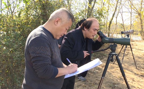 在保護區內,工作人員用望遠鏡、相機等裝備觀察遠處湖內的候鳥,并記錄下各種候鳥的數量、種類和活動規律,為濕地保護提供科學依據。