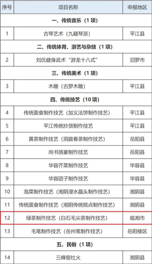 近日,岳陽市人民政府公布了岳陽市第六批市級非物質文化遺產代表性項目名錄,我市申報的綠茶制作技藝(白石毛尖茶制作技藝)被列入岳陽市第六批市級非物質文化遺產代表性項目名錄。