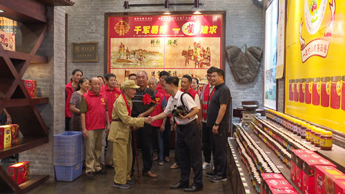 來到十三村生態型工廠,實驗小學師生代表向40余名退役軍人敬獻紅領巾,表達崇高的敬意,并一同參觀醬文化博覽園、禁毒警示館、笑臉墻、地下古醬窖等景點,感受工業旅游的魅力。一路走來,李國武不時拿出相機,躬身、抬手、對焦,伴隨著清脆的快門聲,一張張淳樸燦爛的笑臉被鏡頭精準捕捉定格,留下了寶貴的影像。