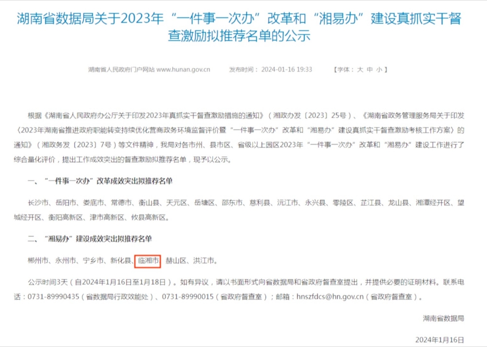 近日,省數據局公示了2023年度“一件事一次辦”改革和“湘易辦”建設真抓實干督查激勵擬推薦名單,我市“湘易辦”建設工作成效突出,名列其中。