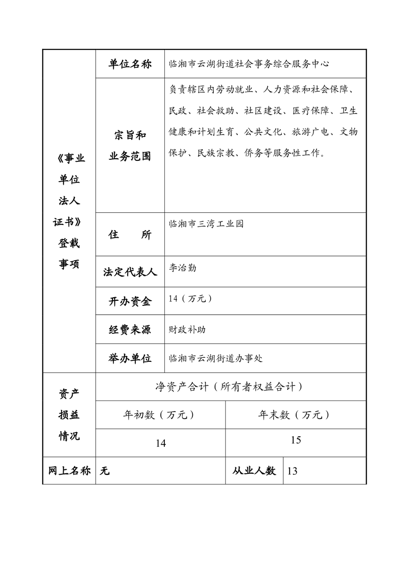 2023年度事業單位法人年度報告書—臨湘市云湖街道社會事務綜合服務中心