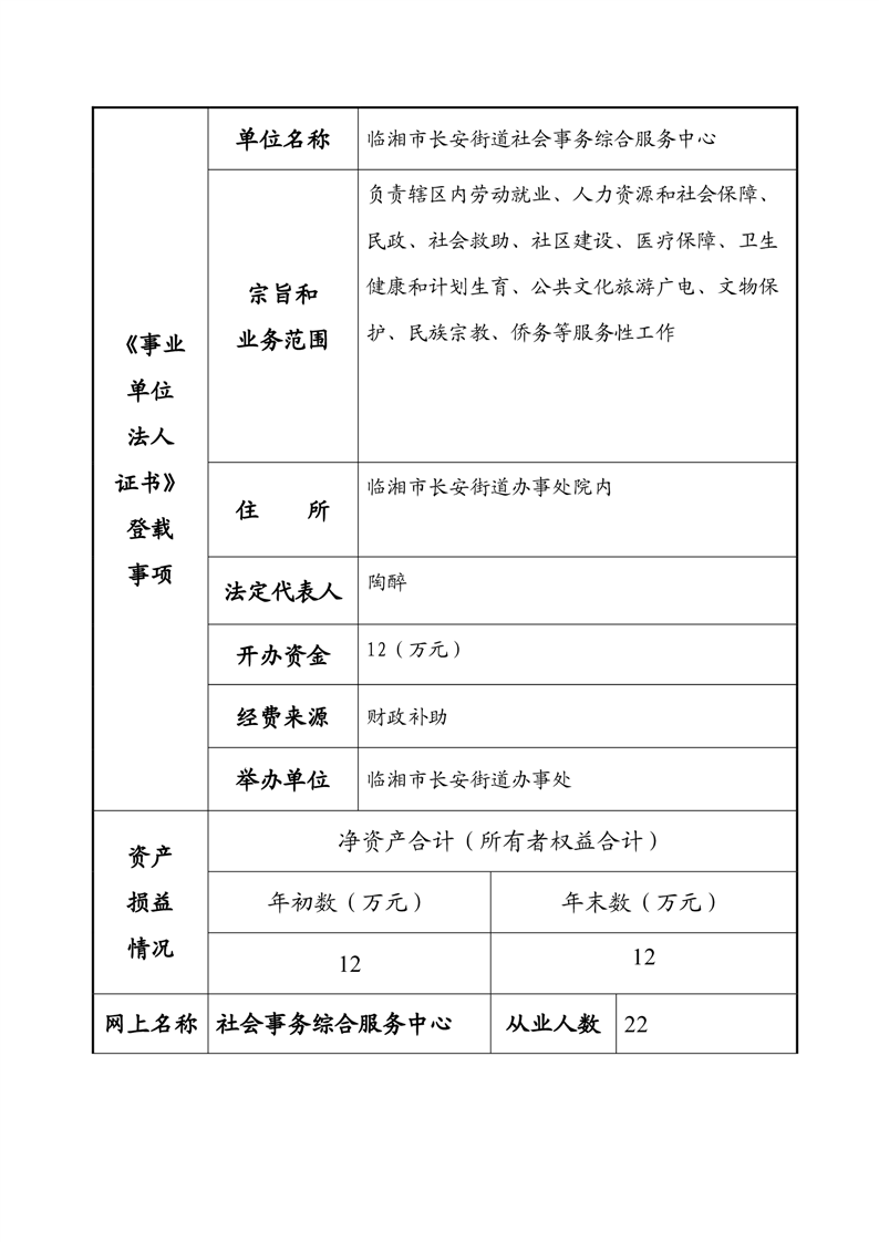2023年度事業單位法人年度報告書—臨湘市長安街道社會事務綜合服務中心