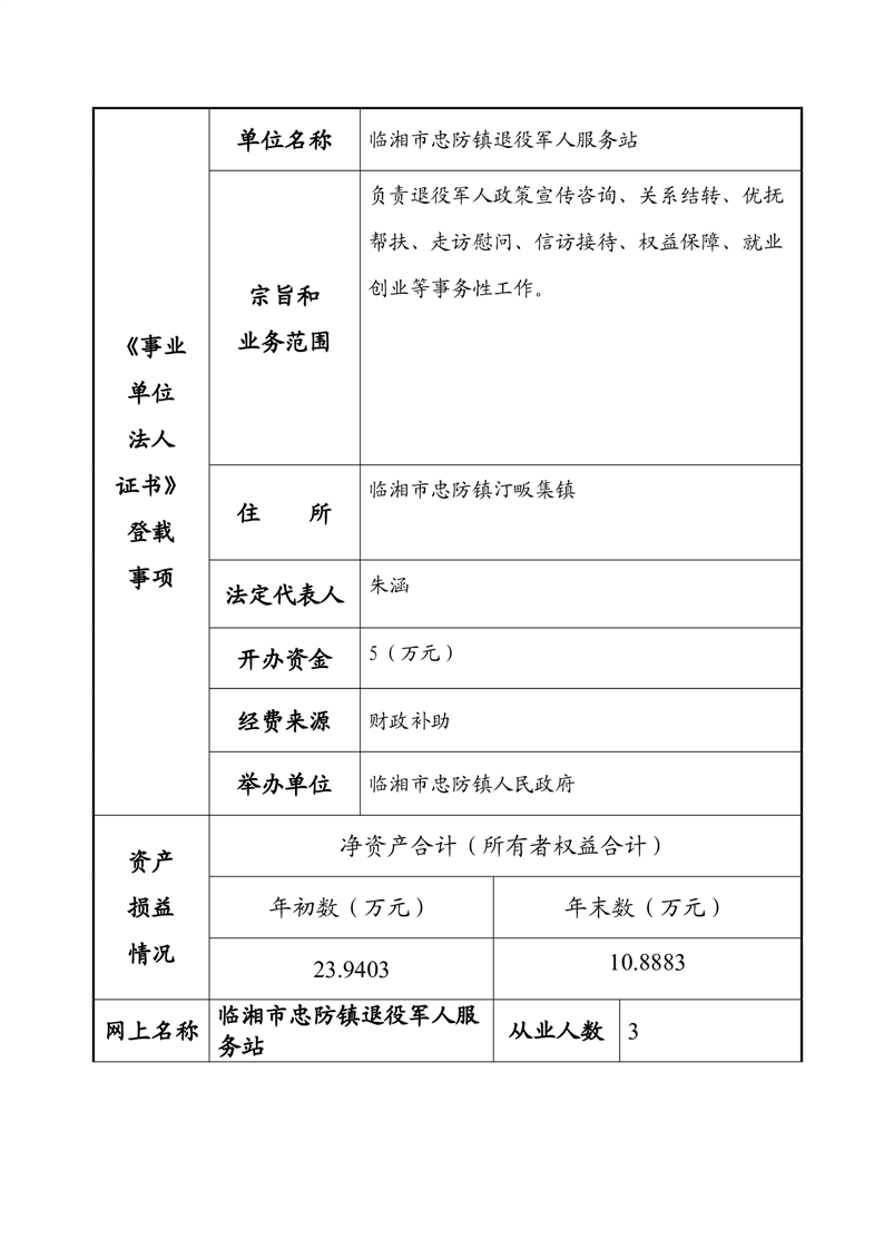 2023年度事業單位法人年度報告書—臨湘市忠防鎮退役軍人服務站