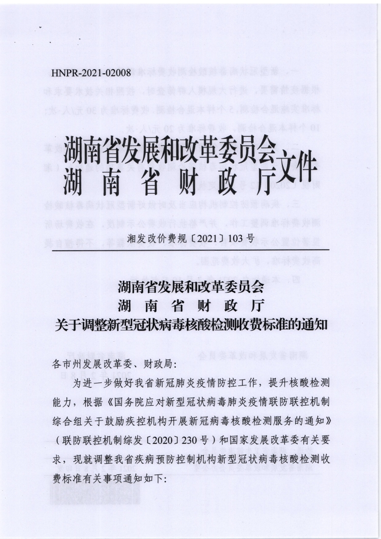 關于調整新型冠狀病毒核酸檢測收費標準的通知