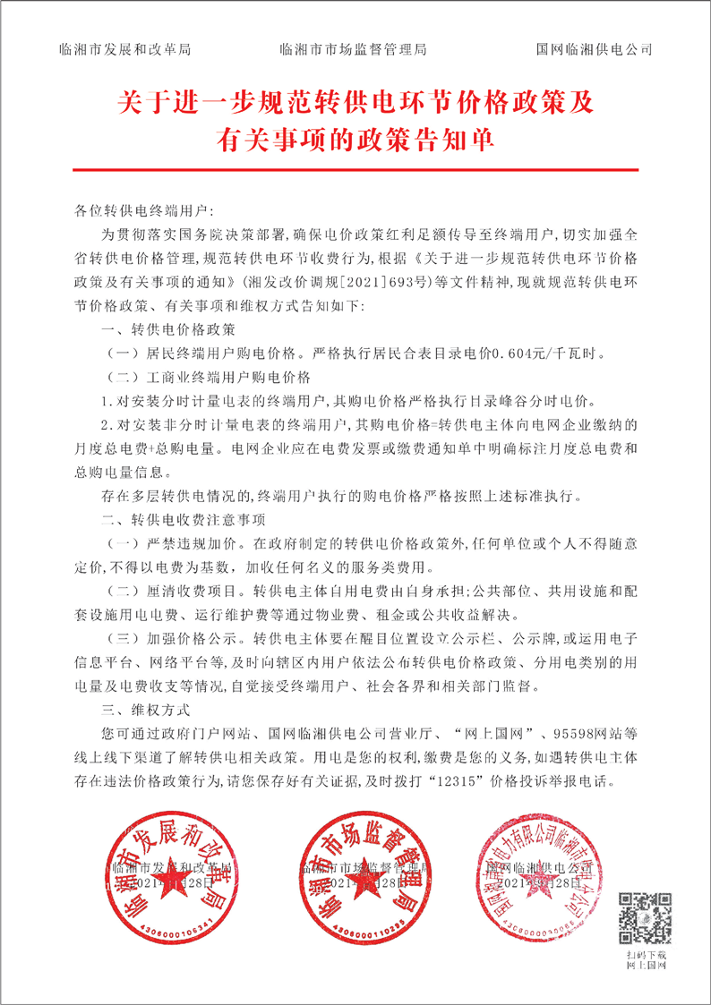 關于進一步規范轉供電環節價格政策及有關事項的政策告知單