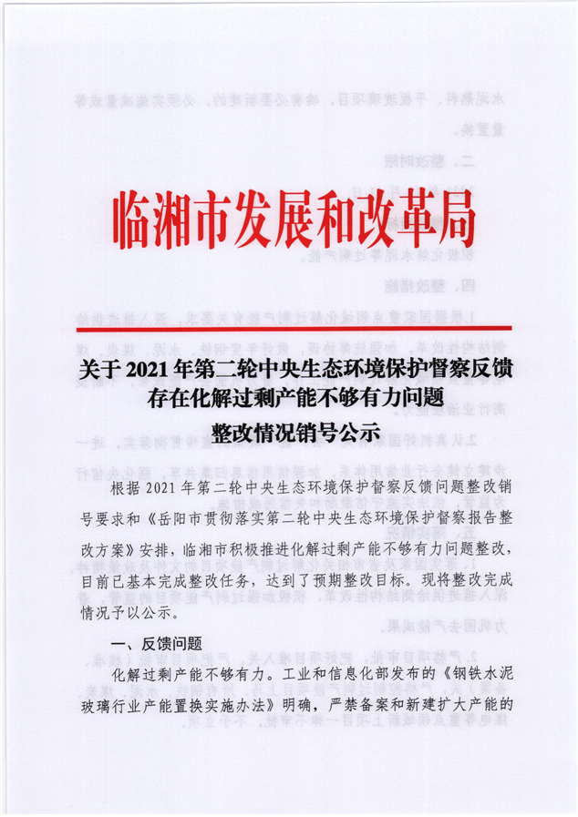 關于2021年第二輪中央生態環境保護督查反饋存在化過剩產能不夠有力問題整改情況銷號公示