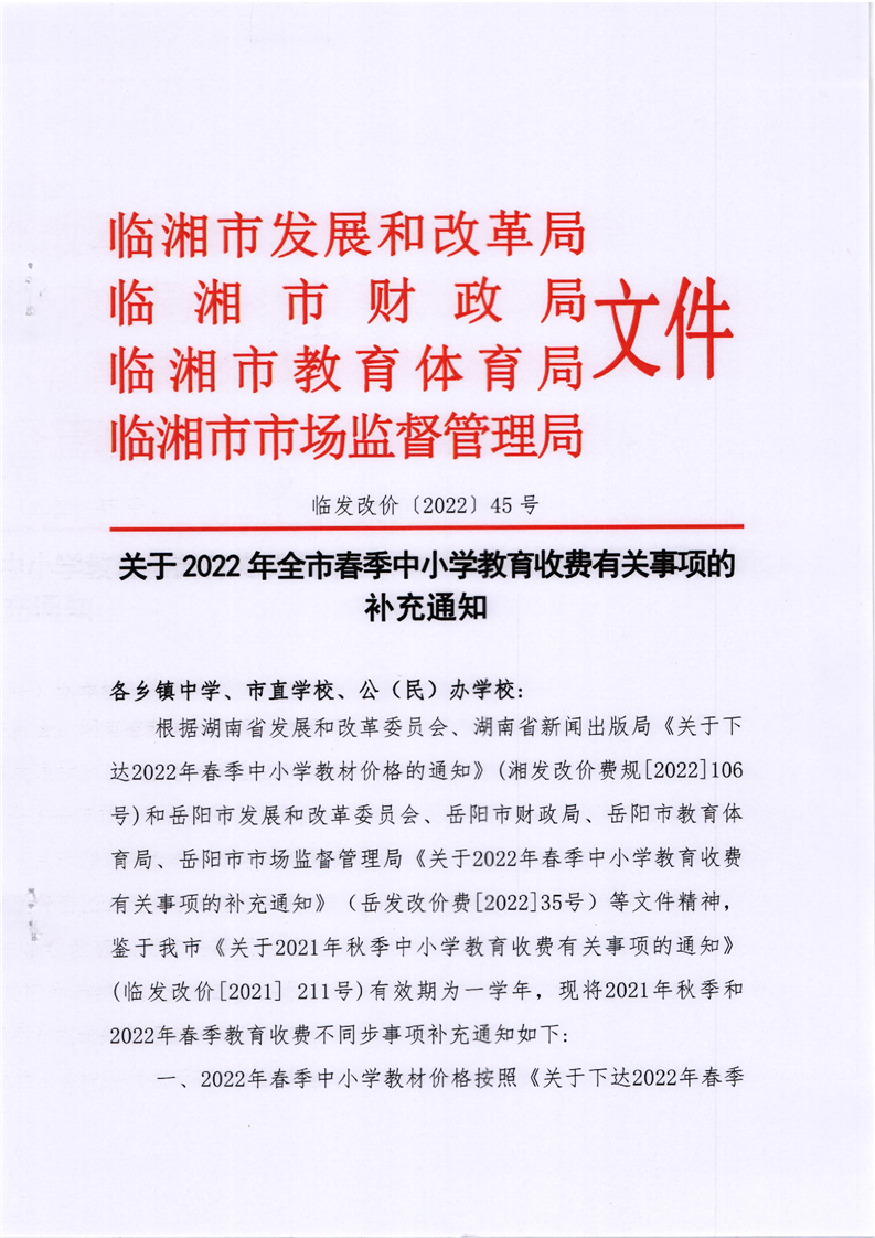 關于2022年全市春季中小學教育收費有關事項的補充通知