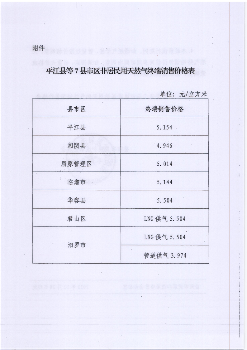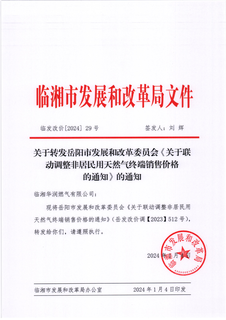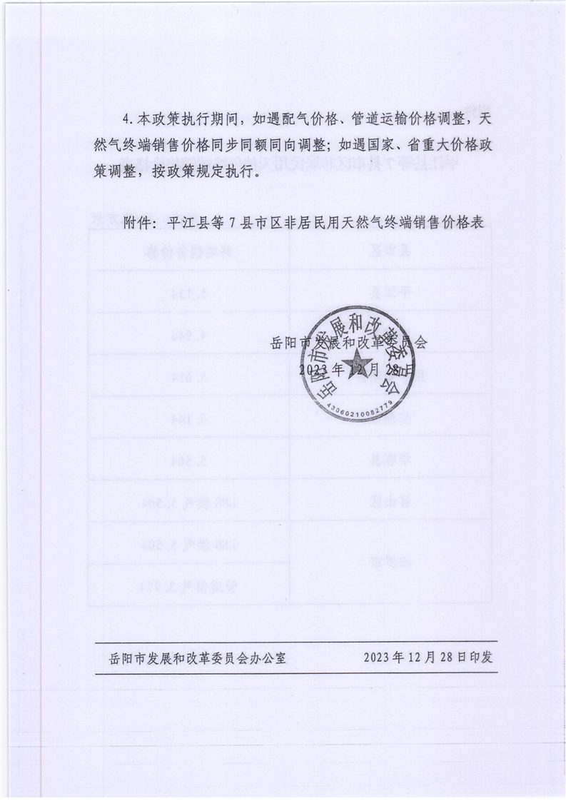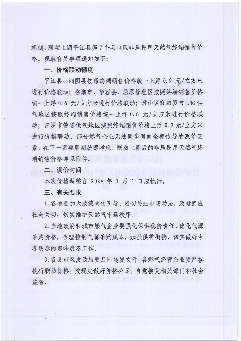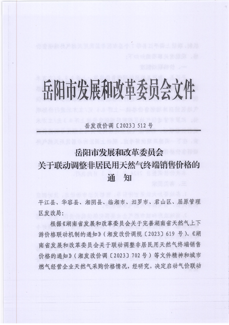 關于轉發(fā)岳陽市發(fā)展和改革委員會《關于聯(lián)動調(diào)整非居民用天然氣終端銷售價格