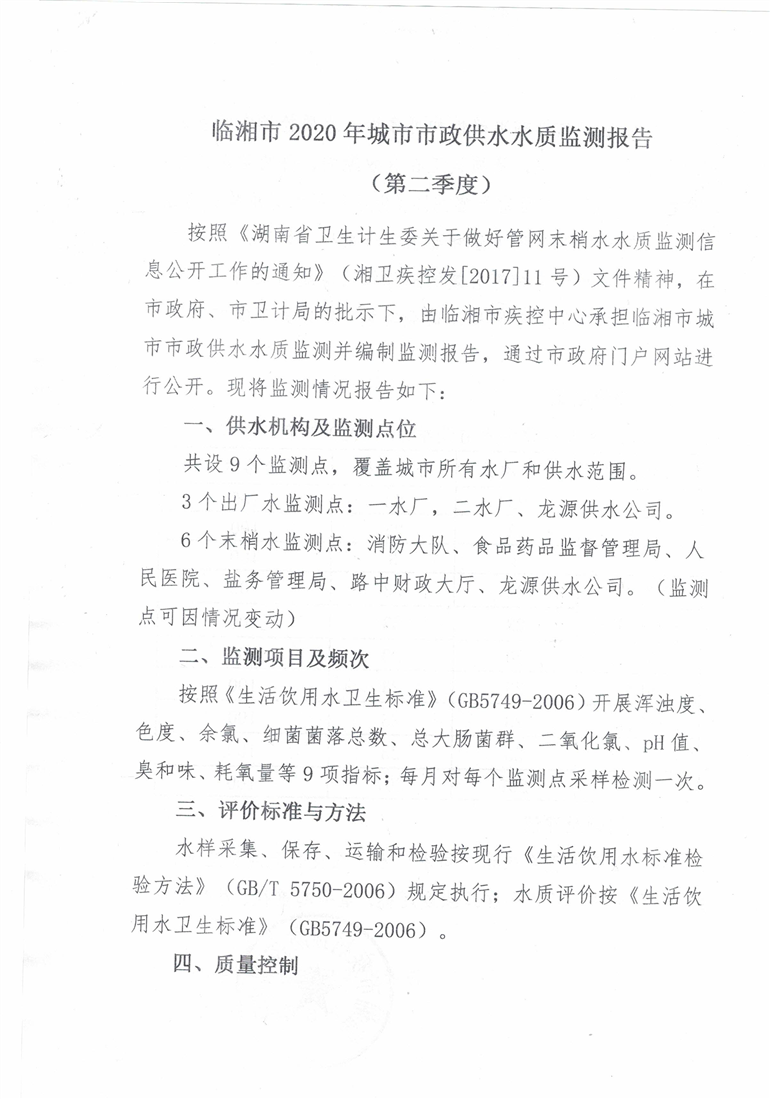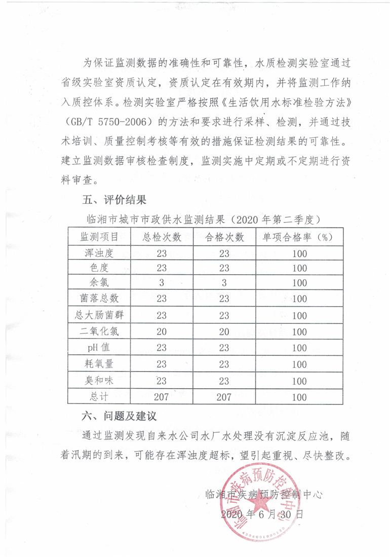 臨湘市2020年城市市政供水水質監測報告(第二季度)