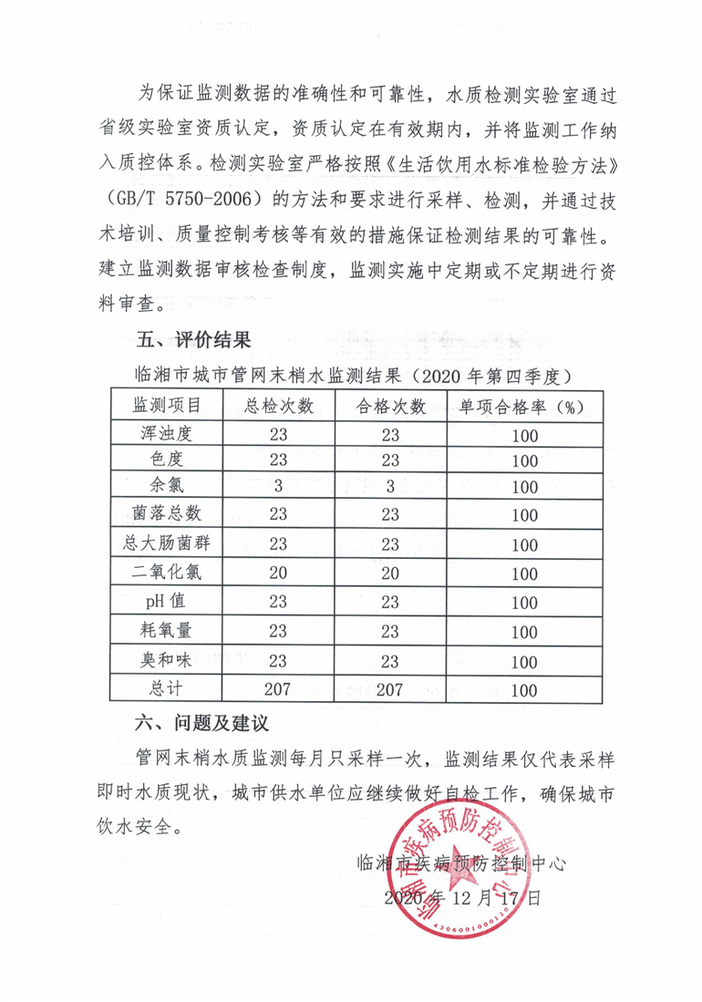 臨湘市2020年度城市管網(wǎng)末梢四度季水質(zhì)監(jiān)測報告