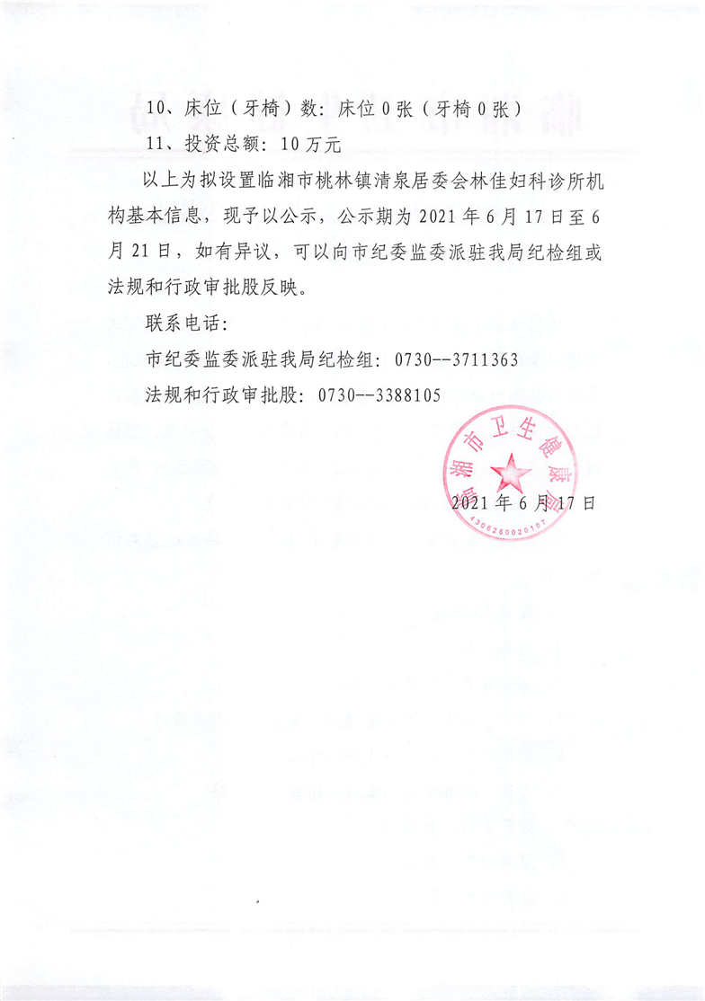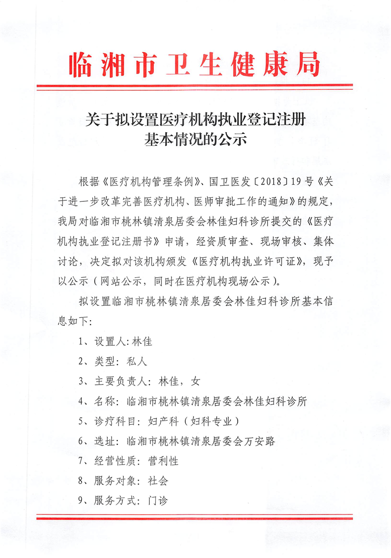 桃林鎮清泉居委會林佳婦科診所執業登記注冊基本情況公示