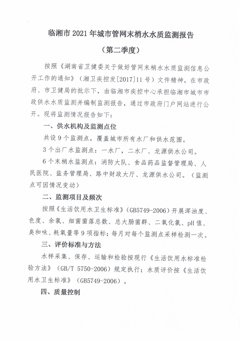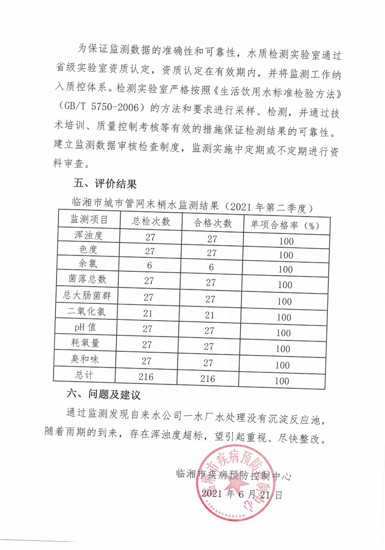臨湘市2021年城市管網末梢水質監測報告(第二季度)