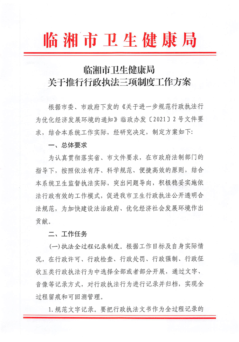 臨湘市衛(wèi)生健康局關(guān)于推行行政執(zhí)法三項(xiàng)制度工作方案