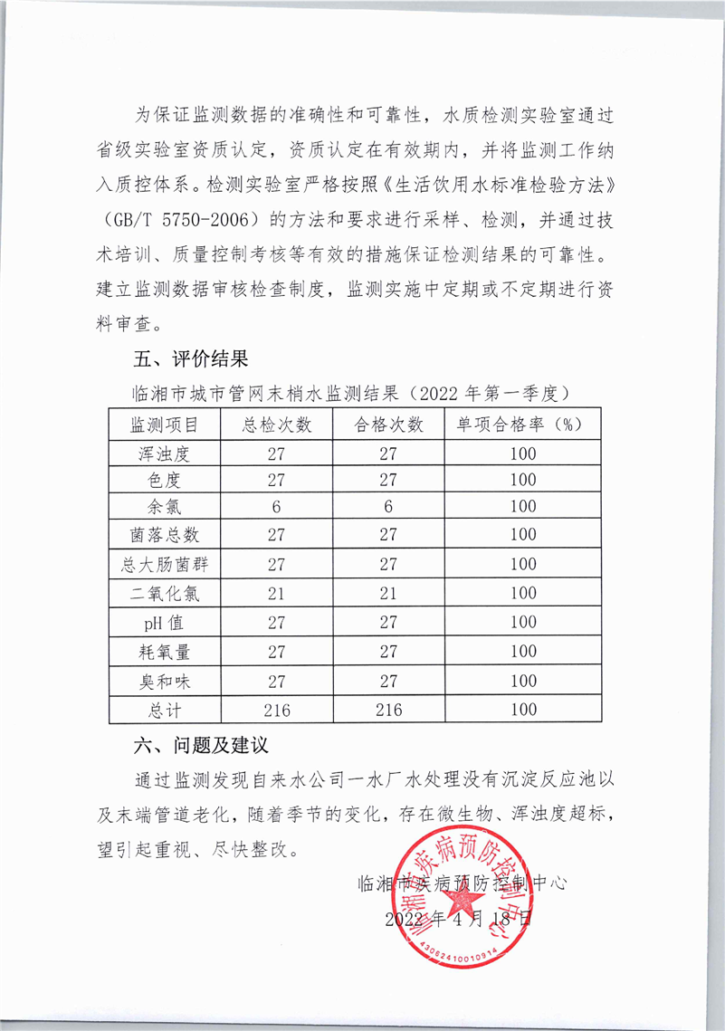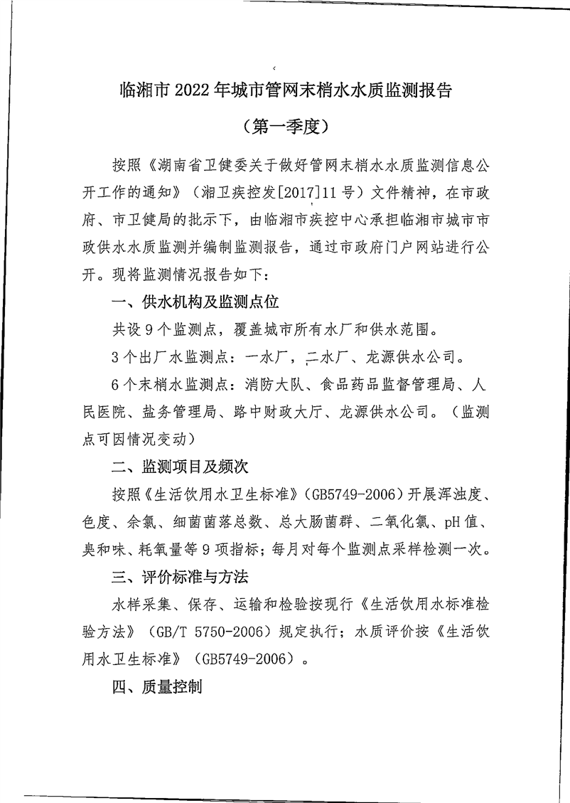 2022年城市管網(wǎng)末梢水水質(zhì)監(jiān)測報告(第一季度)