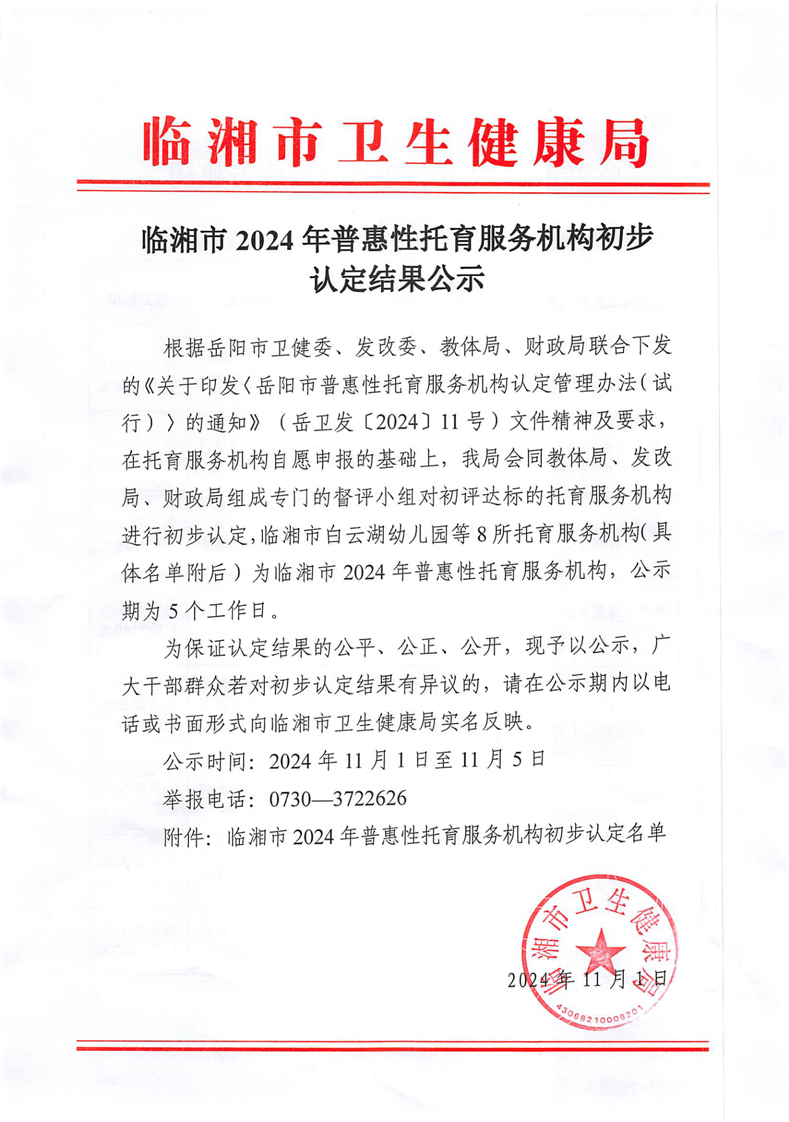 臨湘市2024年普惠性托育服務機構初步認定結果公示