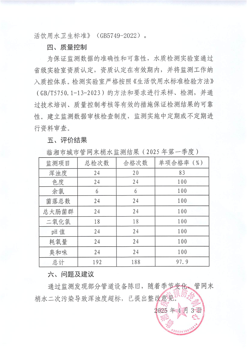 2025年臨湘市城市管網(wǎng)末梢水水質監(jiān)測報告(第一季度)