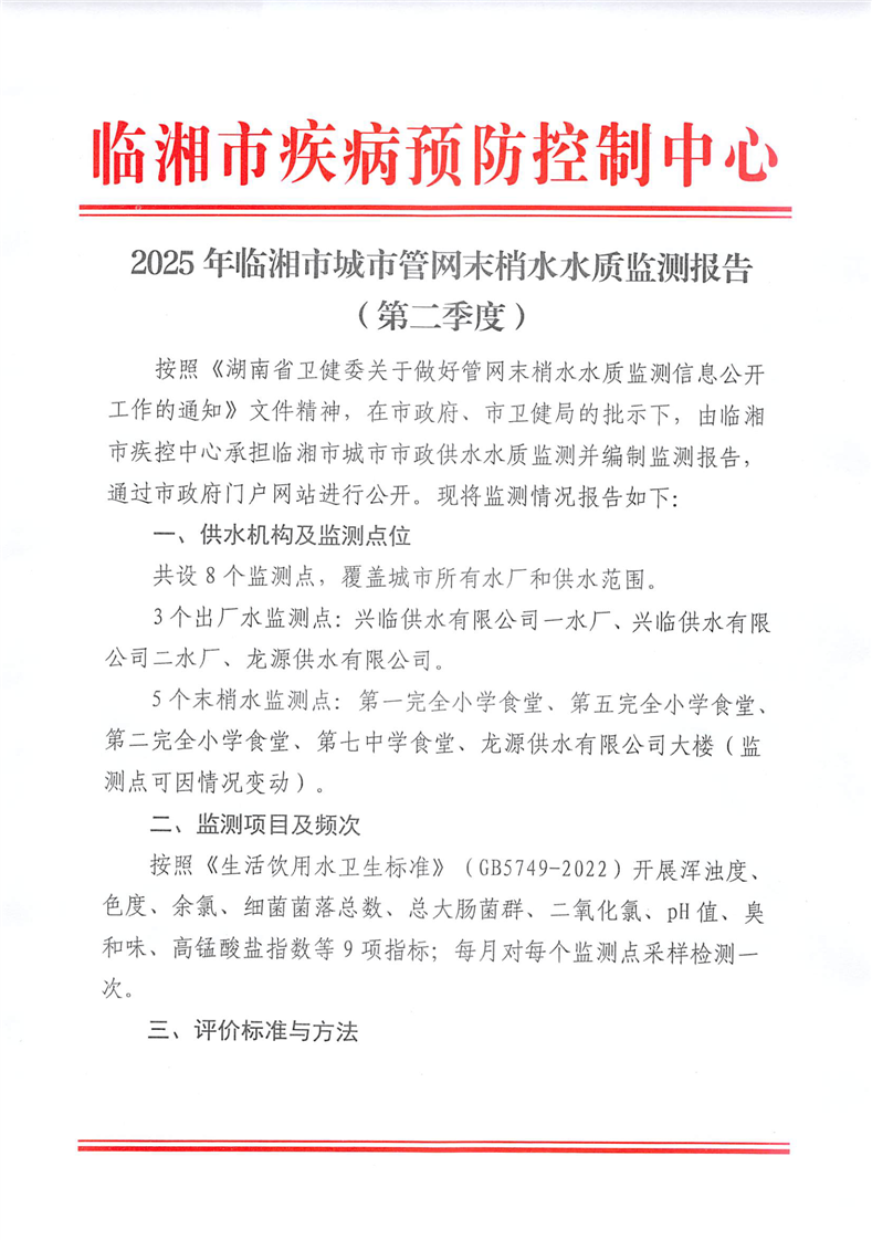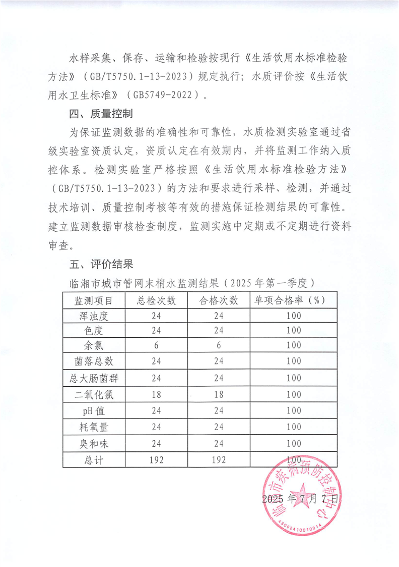 2025年臨湘市城市管網末梢水水質監測報告(第二季度)