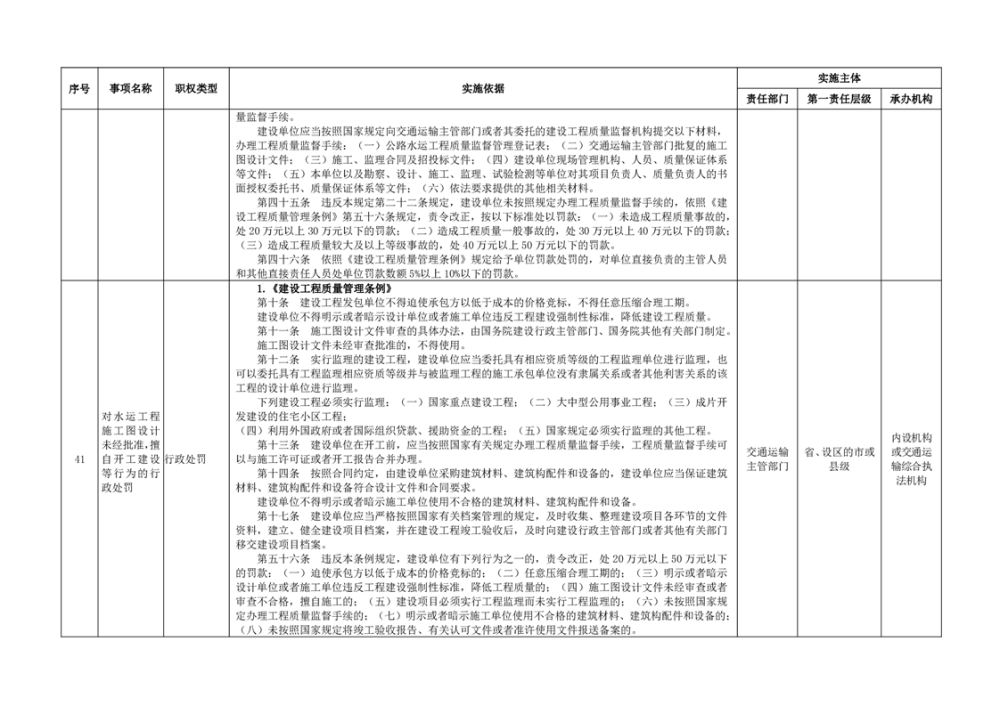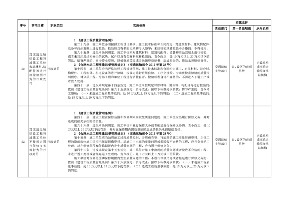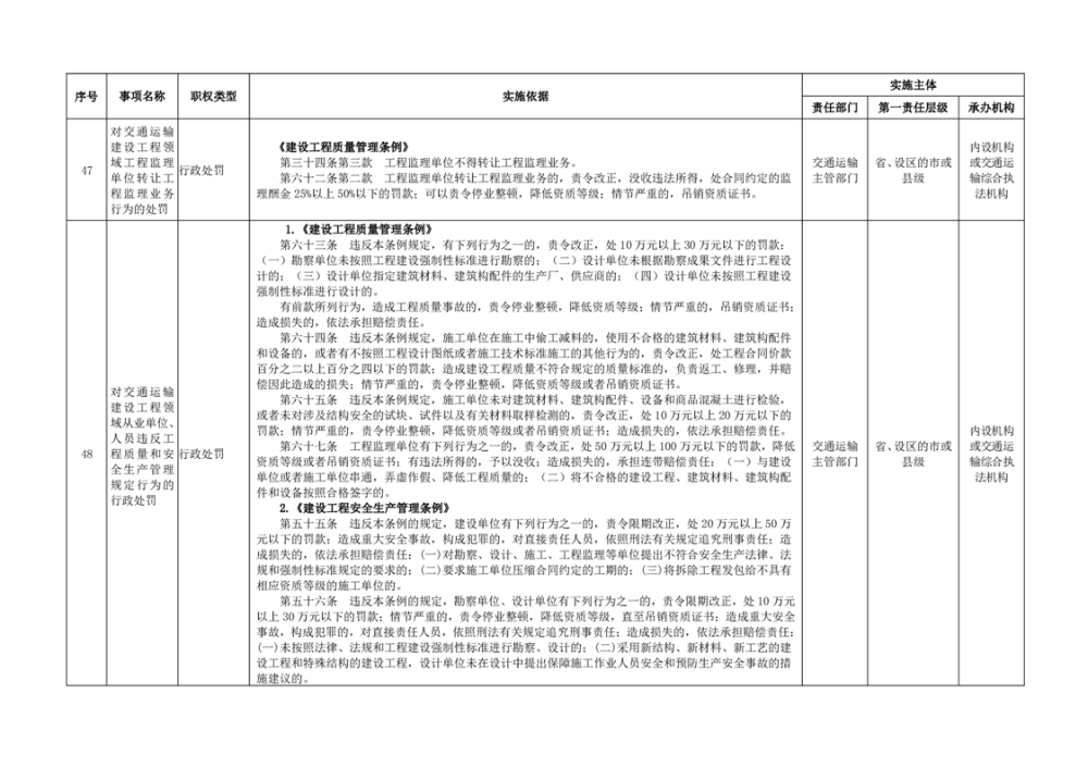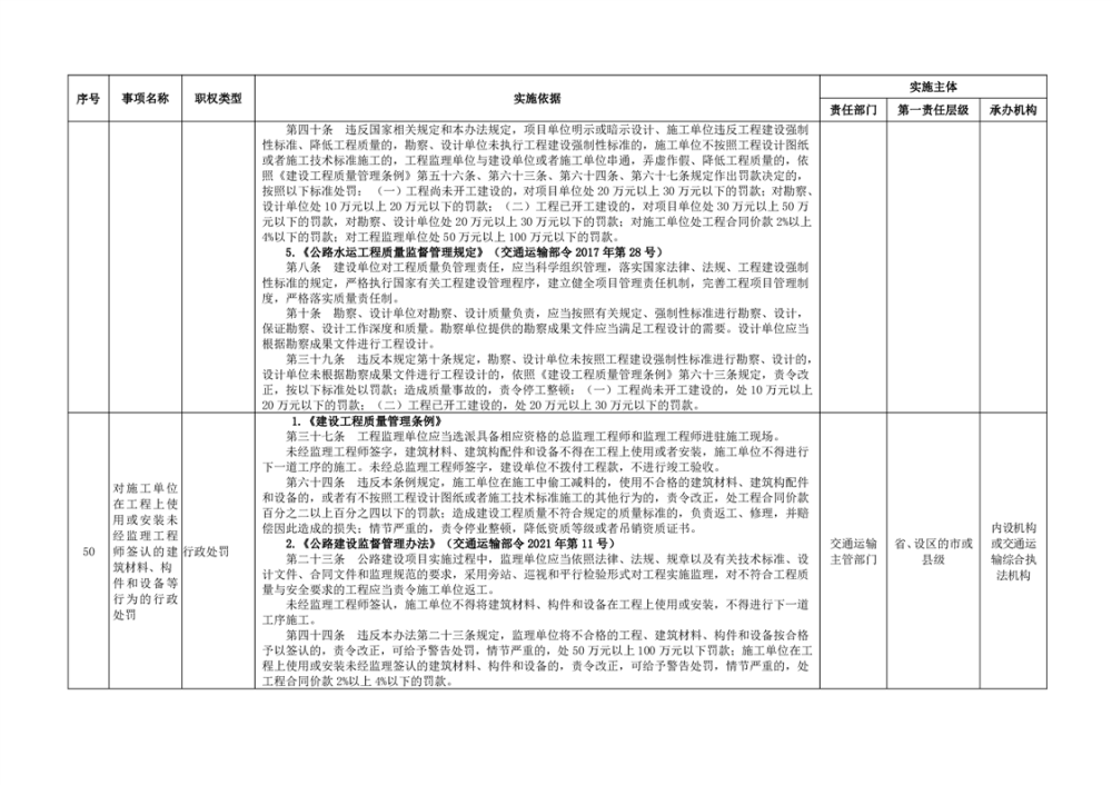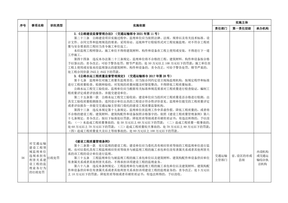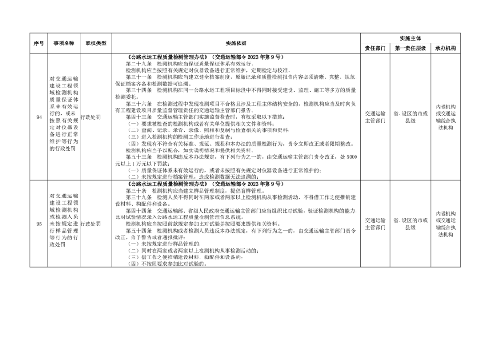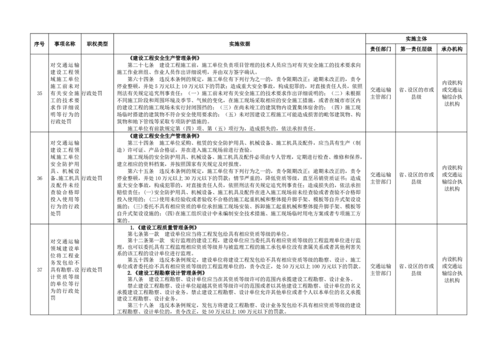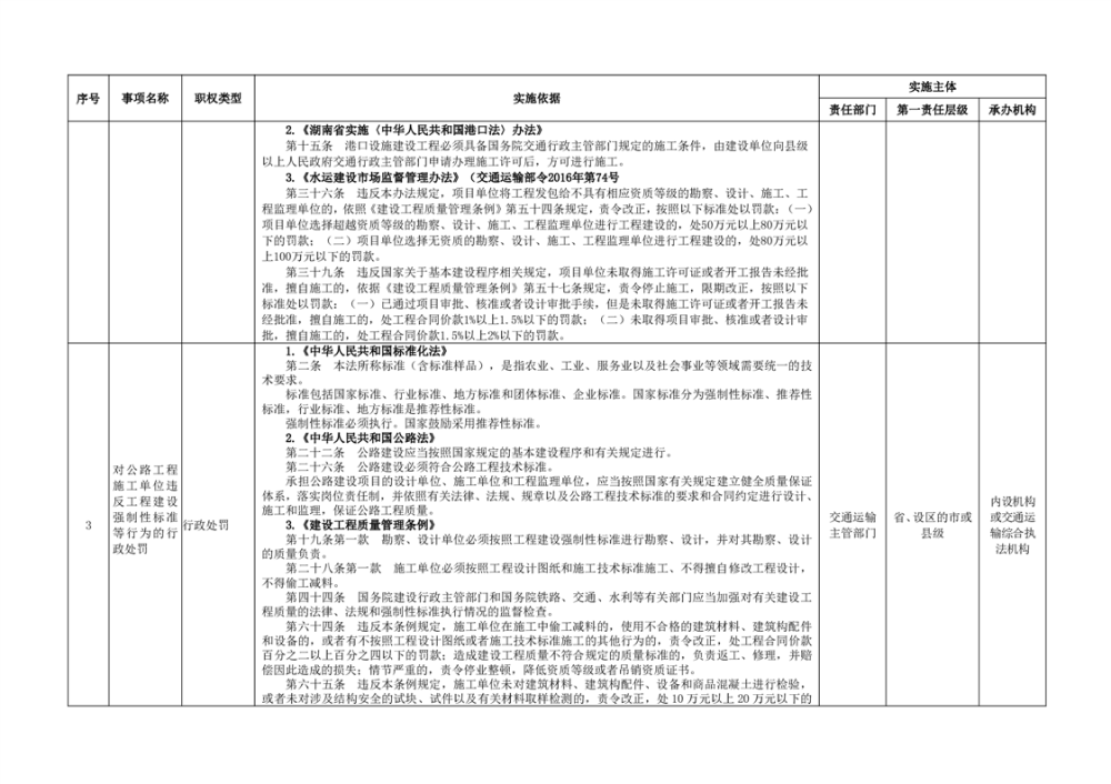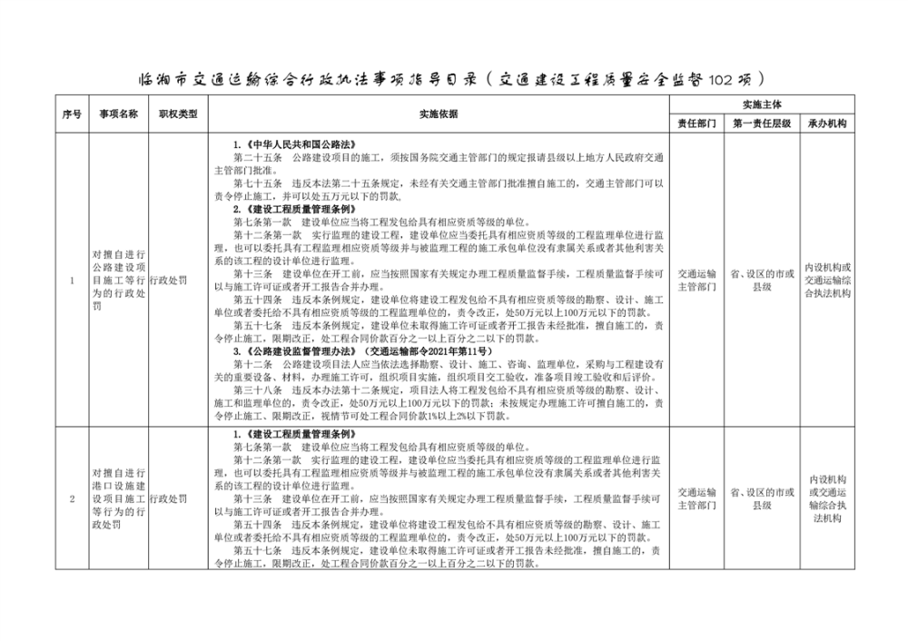 臨湘市交通運輸綜合行政執法事項指導目錄 交通建設工程質量安全監督102項