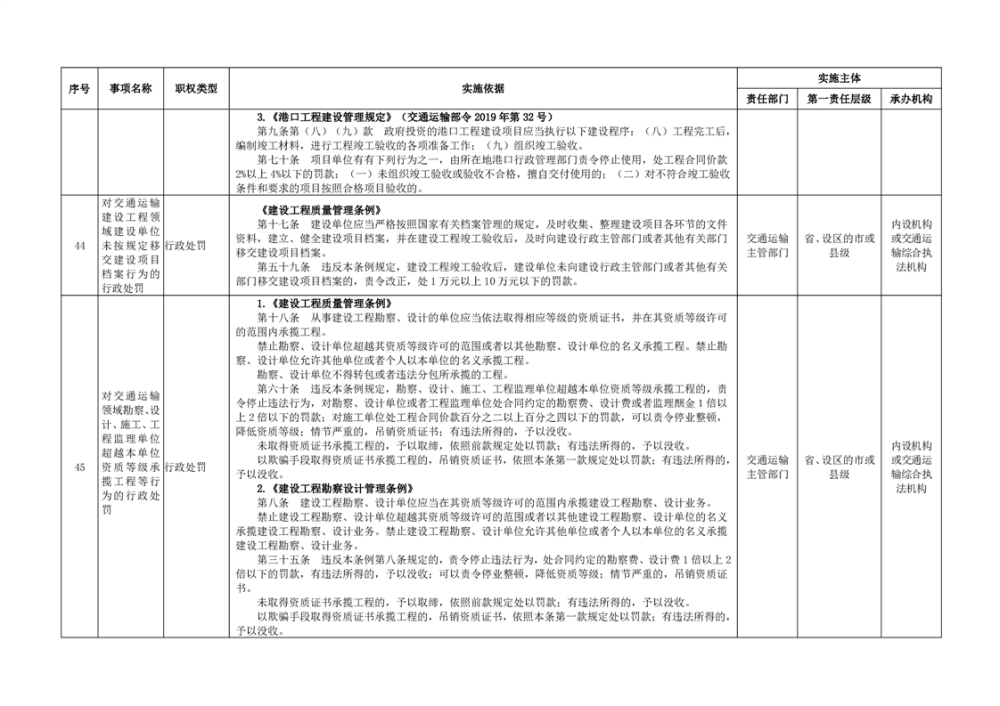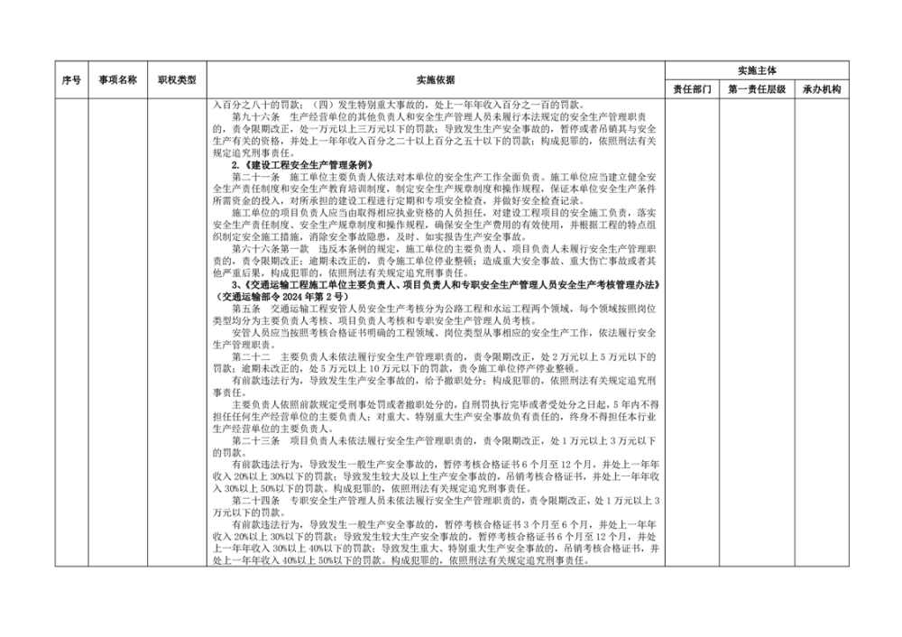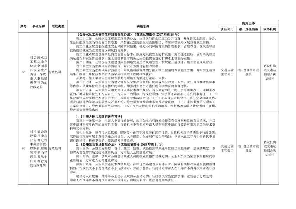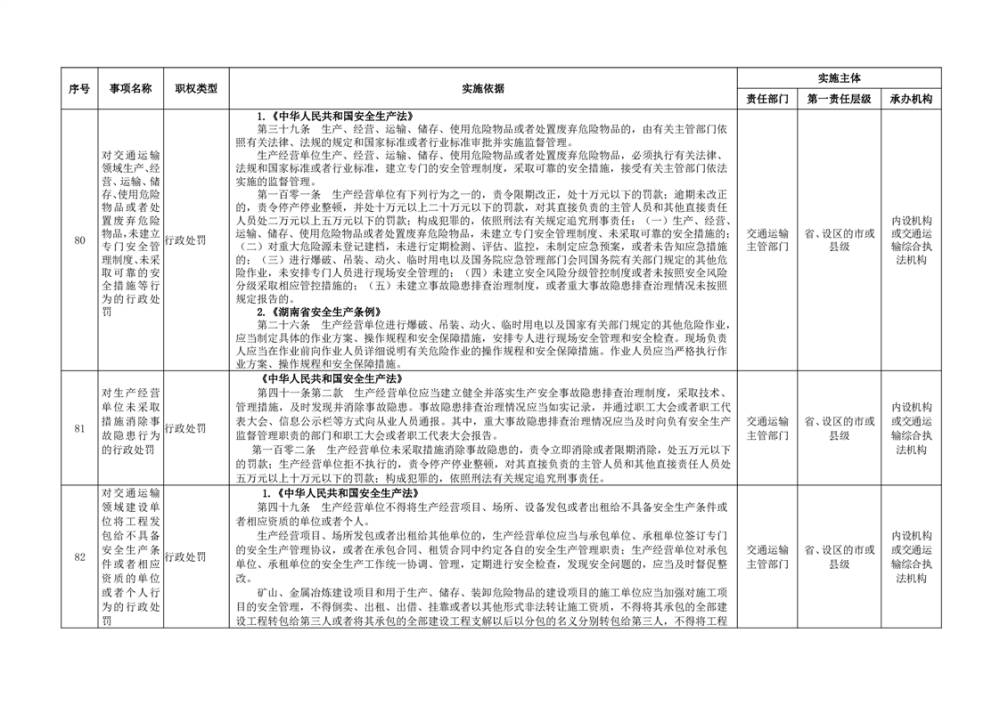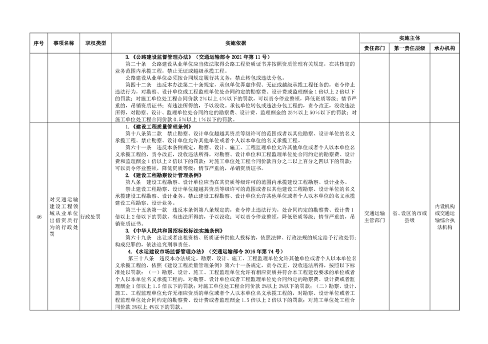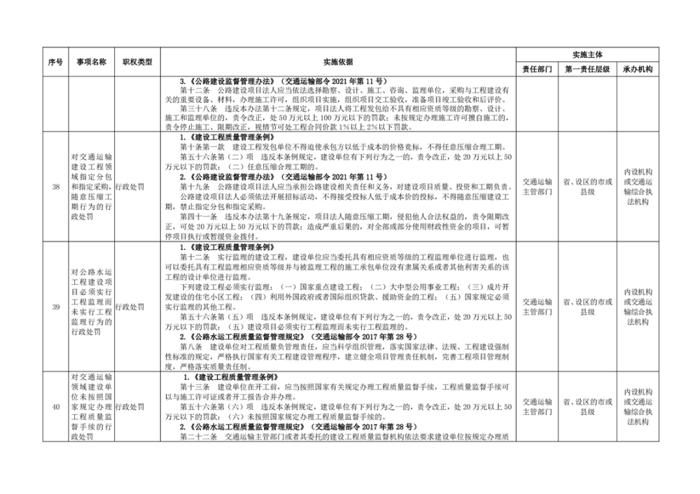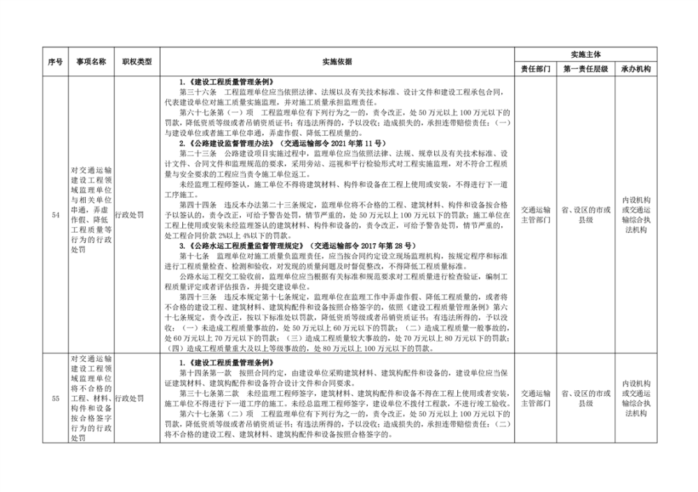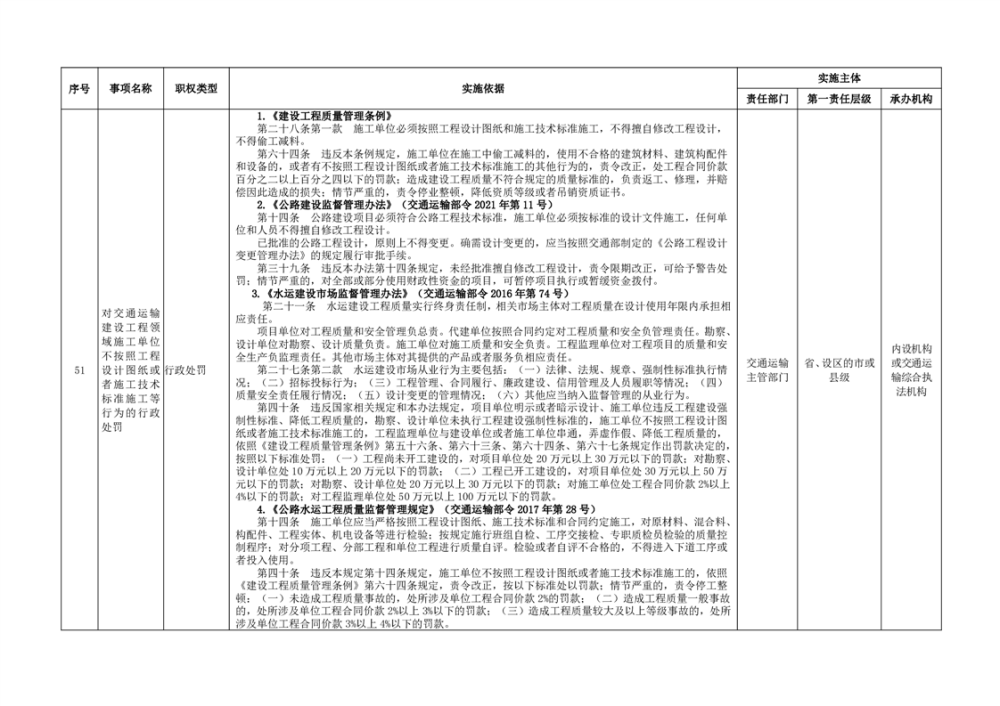 臨湘市交通運輸綜合行政執法事項指導目錄 交通建設工程質量安全監督102項
