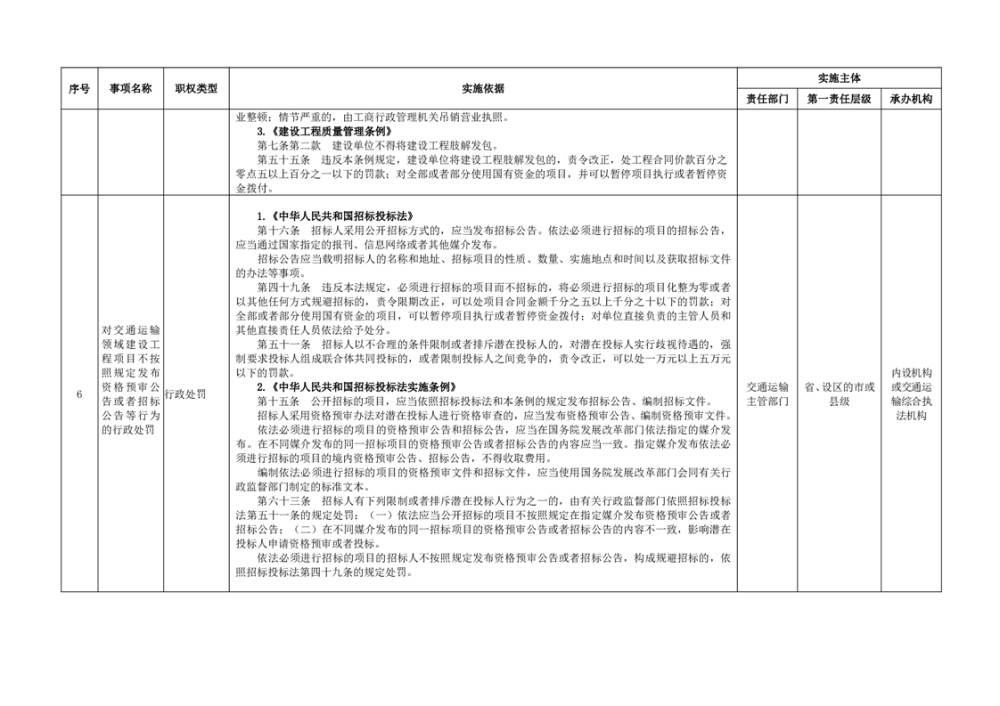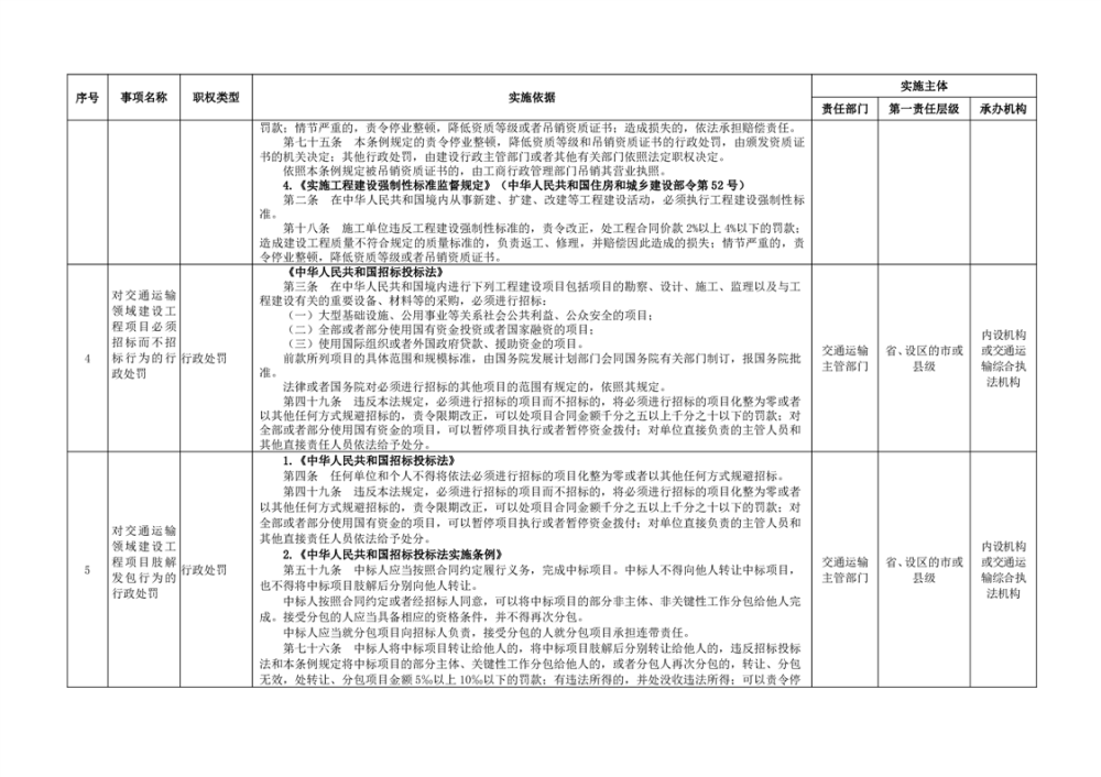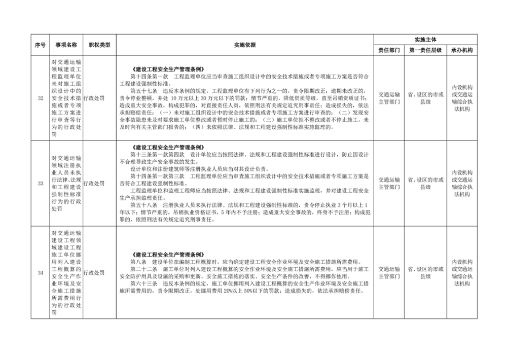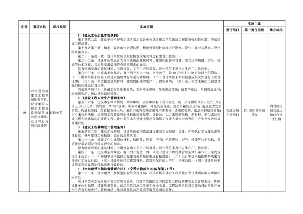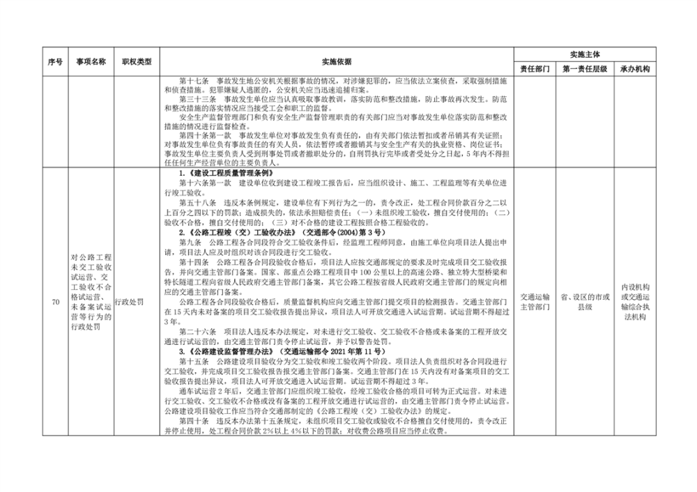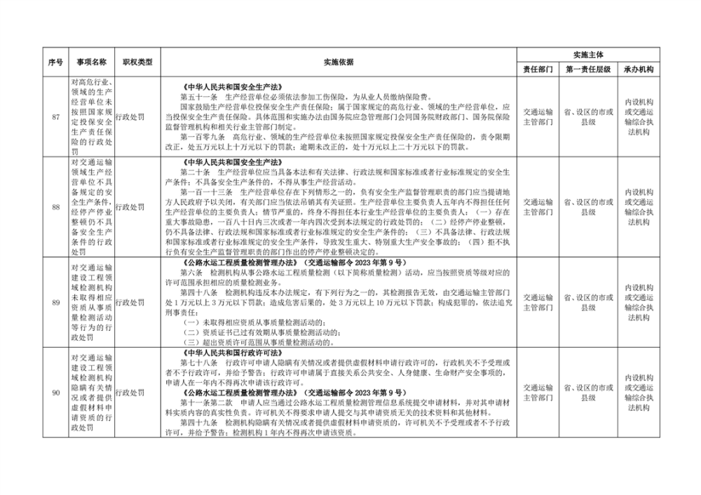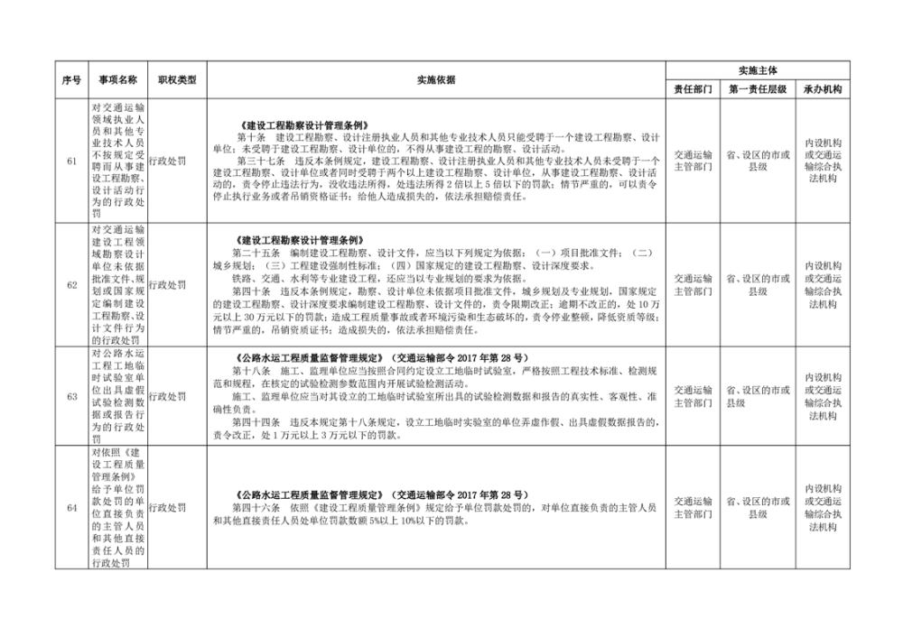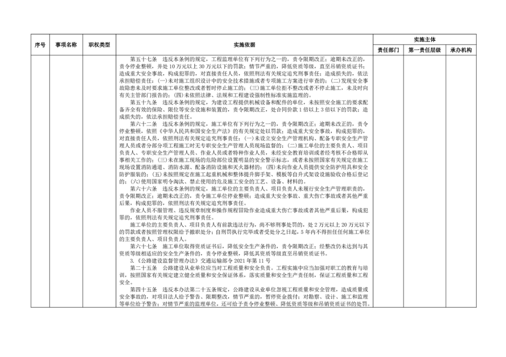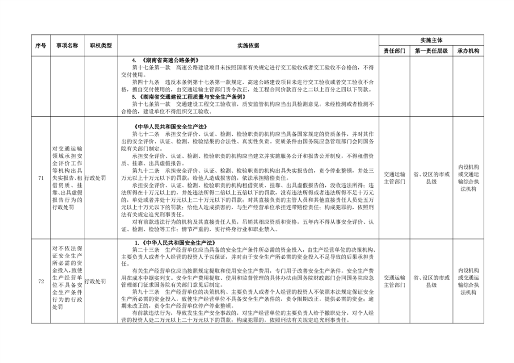 臨湘市交通運輸綜合行政執法事項指導目錄 交通建設工程質量安全監督102項
