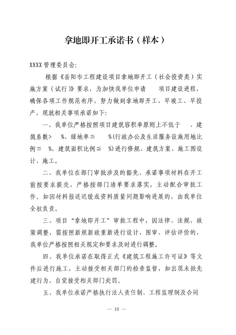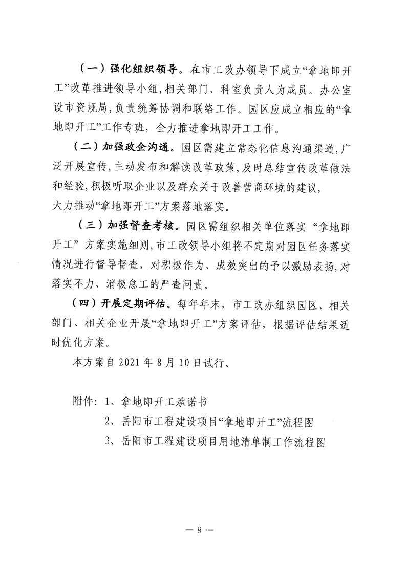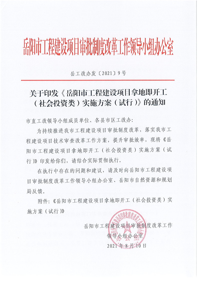 《岳陽市工程建設項目拿地即開工(社會投資)實施方案(試行)》的通知(岳工改辦發〔2021〕9號)