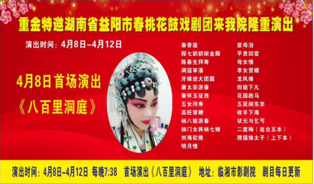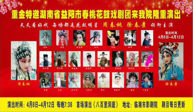 為配合我市禁賭工作,弘揚(yáng)傳統(tǒng)文化,豐富群眾文化生活,美臨公司特邀“益陽春桃花鼓戲劇團(tuán)”來我市文化交流演出。請各位戲劇愛好者互相轉(zhuǎn)告,演員陣容強(qiáng)大,名星薈萃,劇目豐富。