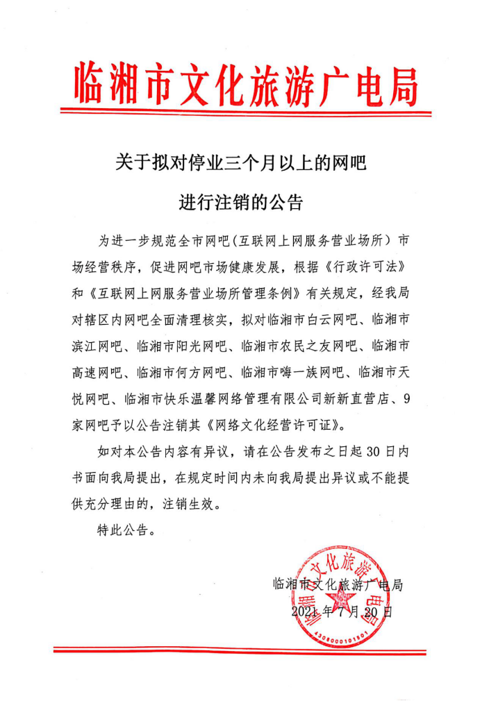 關(guān)于擬對停業(yè)三個月以上的網(wǎng)吧進(jìn)行注銷的公告
