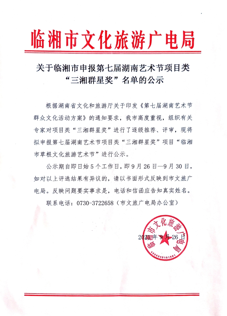 關(guān)于臨湘市申報第七屆湖南藝術(shù)節(jié)項目類“三湘群星獎”名單公示