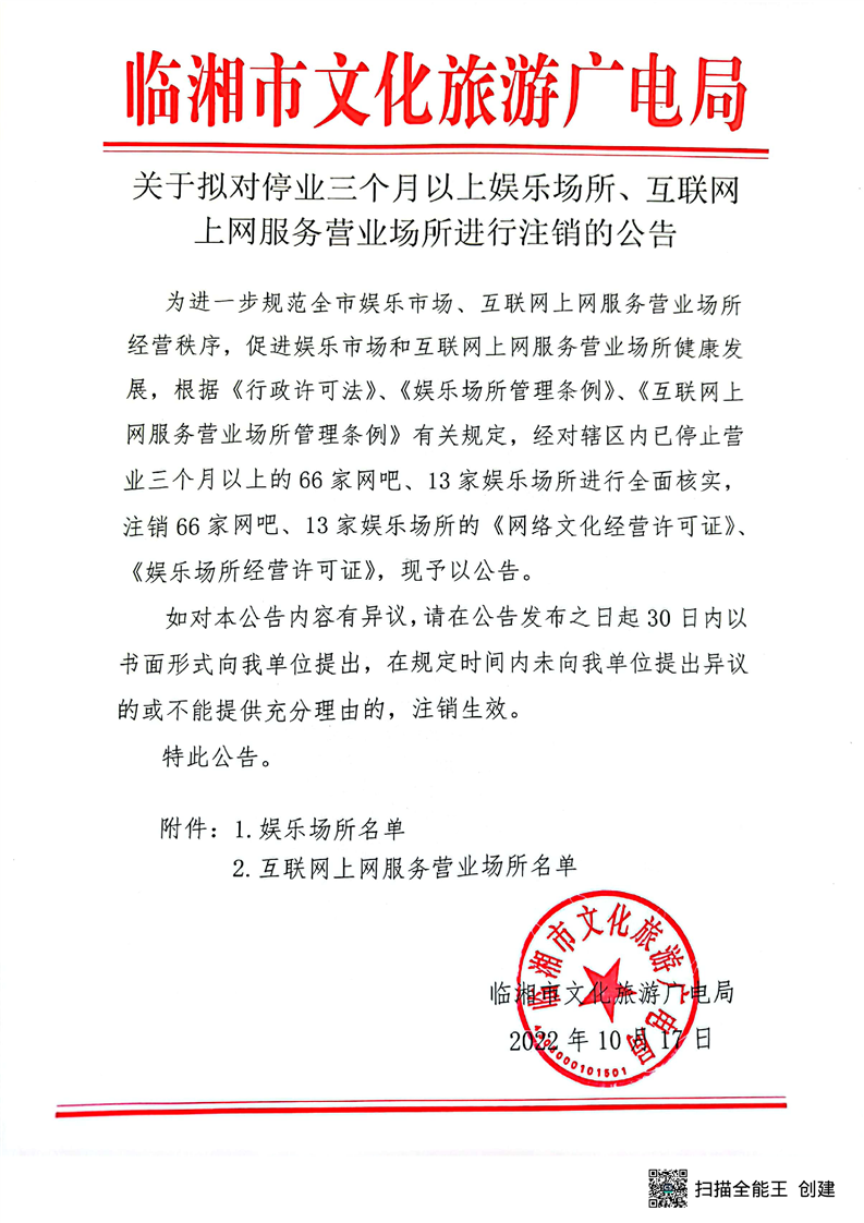 關(guān)于擬對(duì)停業(yè)三個(gè)月以上娛樂場(chǎng)所、互聯(lián)網(wǎng)上網(wǎng)服務(wù)營(yíng)業(yè)場(chǎng)所進(jìn)行注銷的公告