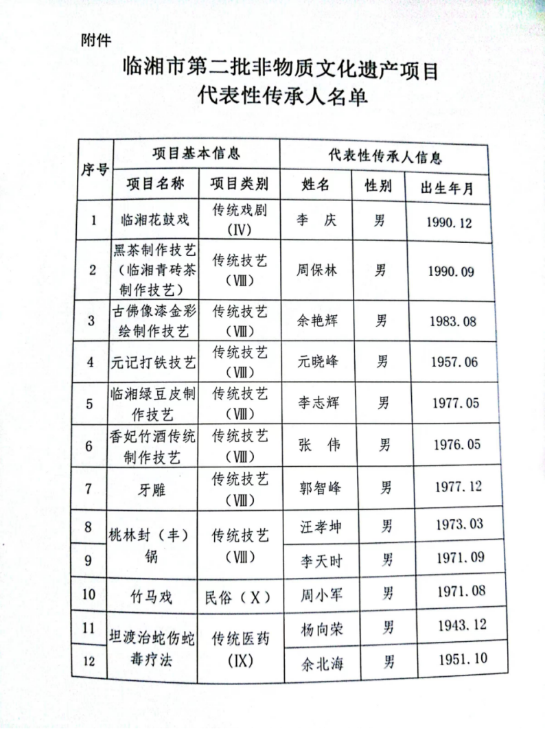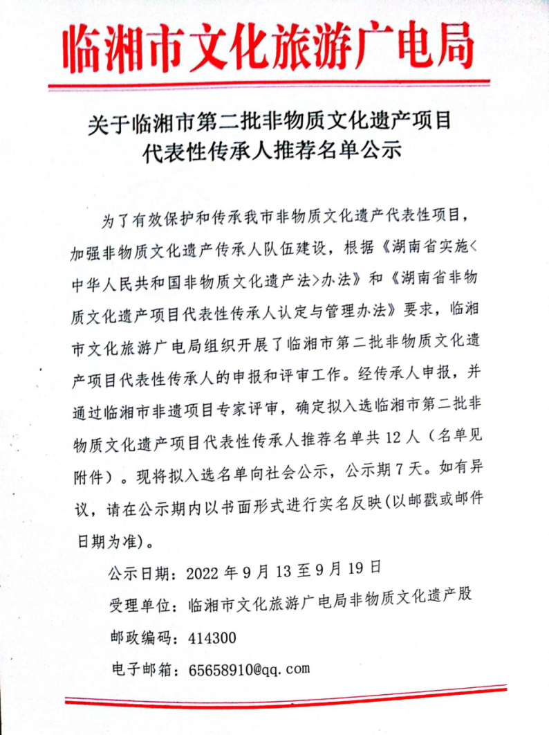 關(guān)于臨湘市第二批非物質(zhì)文化遺產(chǎn)項(xiàng)目代表性傳承人推薦名單公示