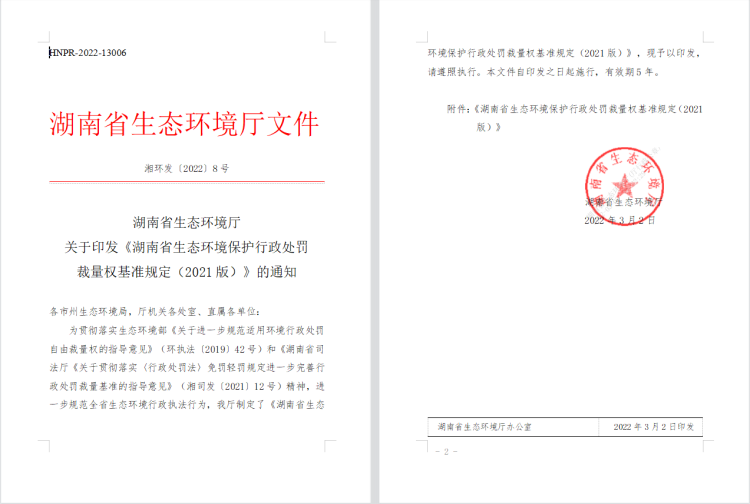關于印發《湖南省生態環境保護行政處罰裁量權基準規定(2021版)》的通知