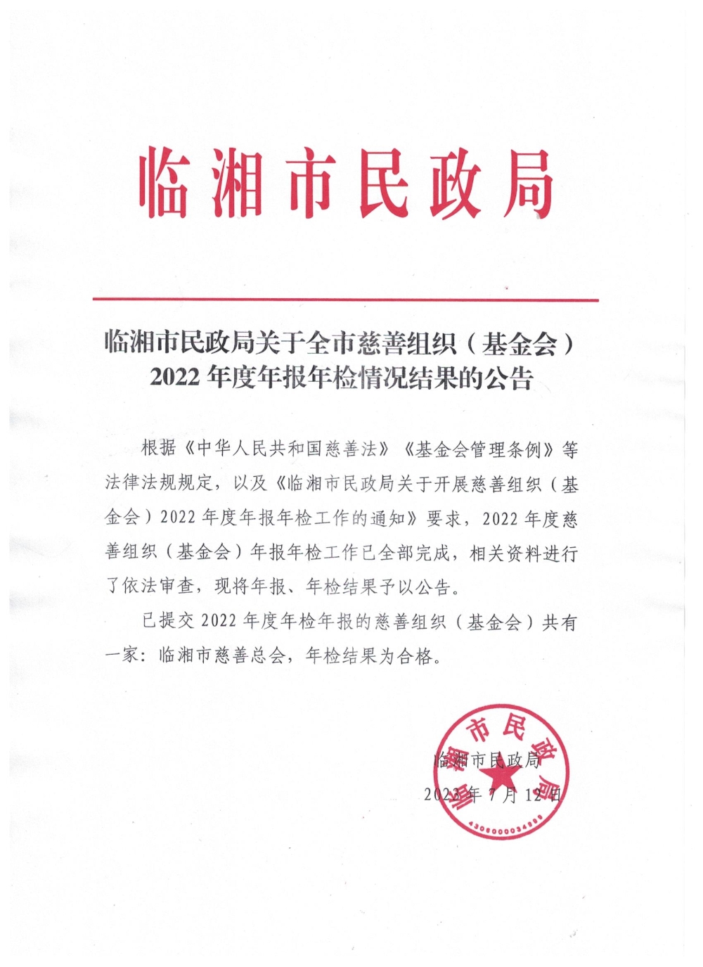 臨湘市民政局關(guān)于市本級(jí)慈善組織(基金會(huì))2022年度年檢年報(bào)結(jié)果的公告