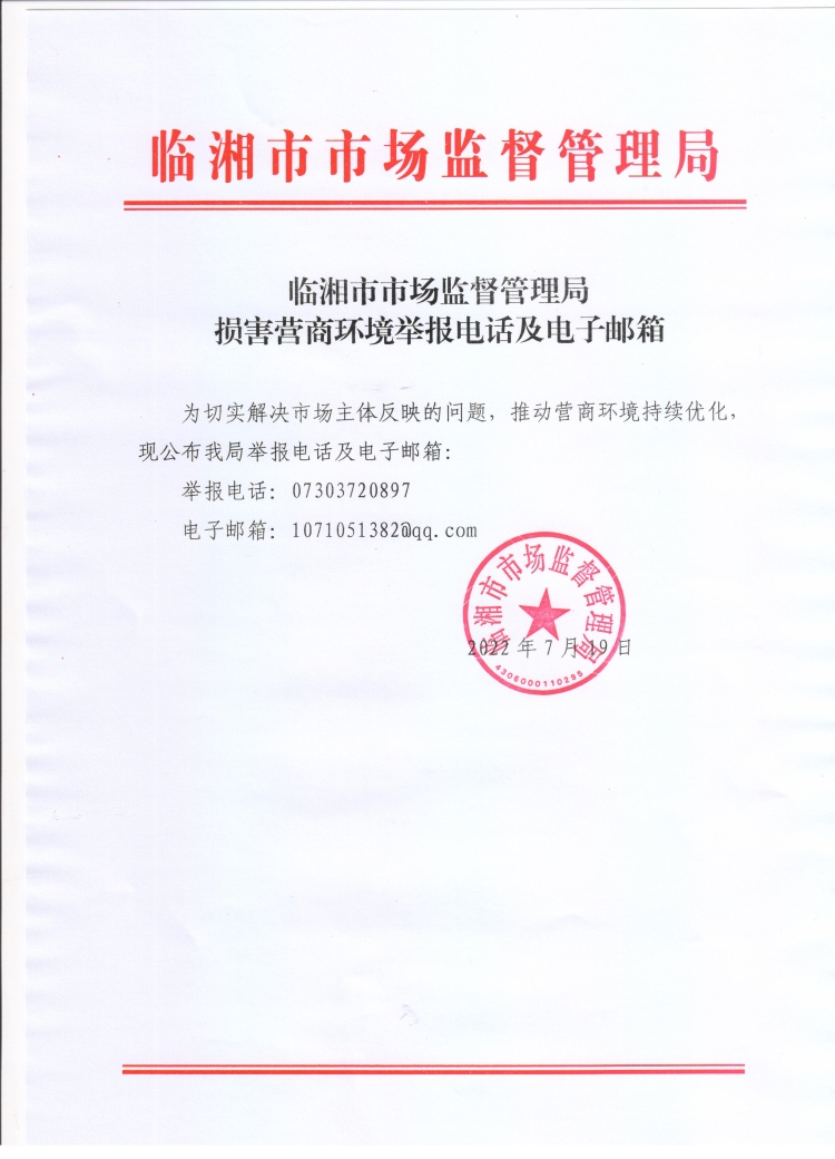 臨湘市市場監督管理局損害營商環境舉報電話及電子郵箱
