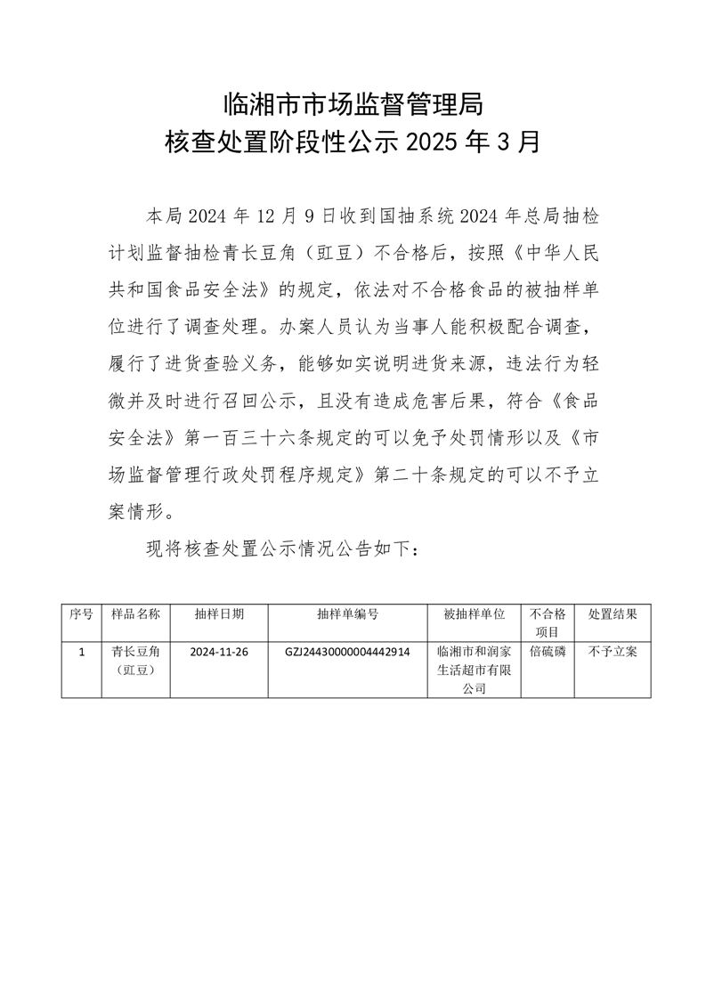 臨湘市市場監督管理局 核查處置階段性公示2025年3月