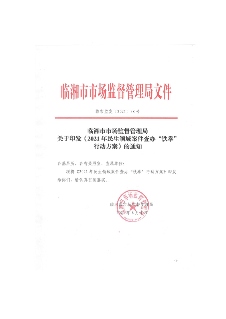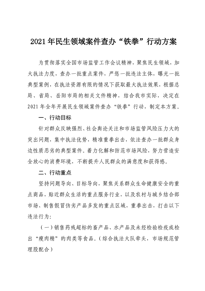 臨湘市市場監督管理局關于印發《2021年民生領域案件查辦“鐵拳”行動方案》的通知