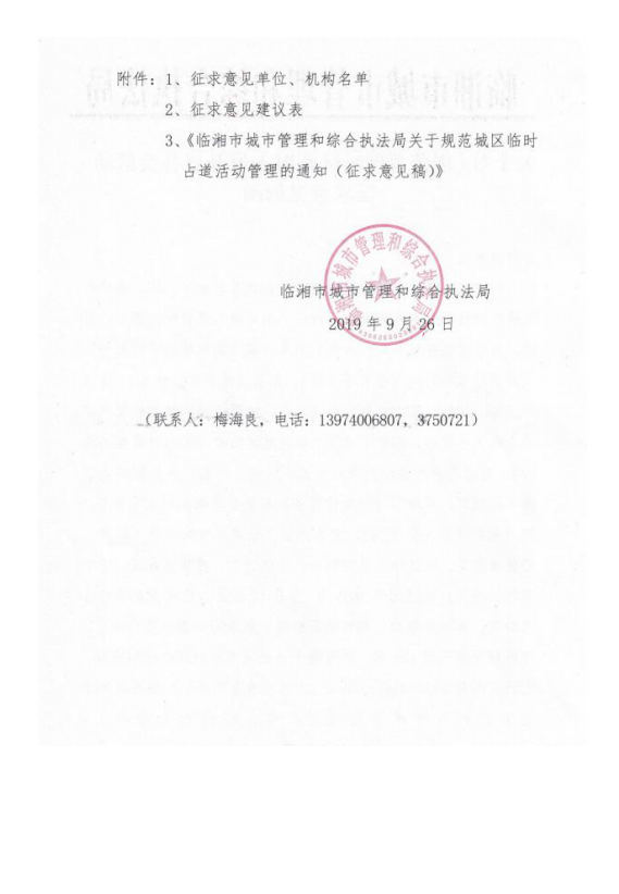 關于對《規范管理城區臨時占道開展各類活動》征求意見的函