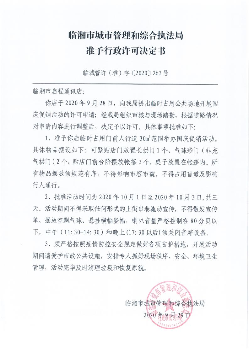 臨湘市啟程通訊店辦理臨時占用街道兩側和公共場地許可