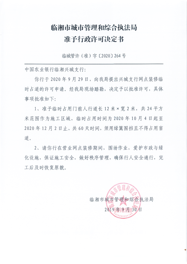 中國農(nóng)業(yè)銀行臨湘興城支行辦理臨時(shí)占用城市道路許可