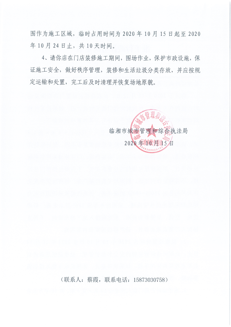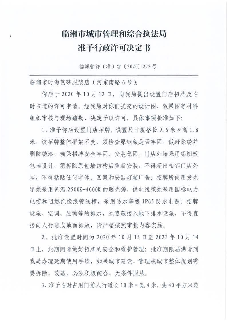 臨湘市時尚芭莎服裝店辦理門店招牌設置、臨時占用城市道路許可