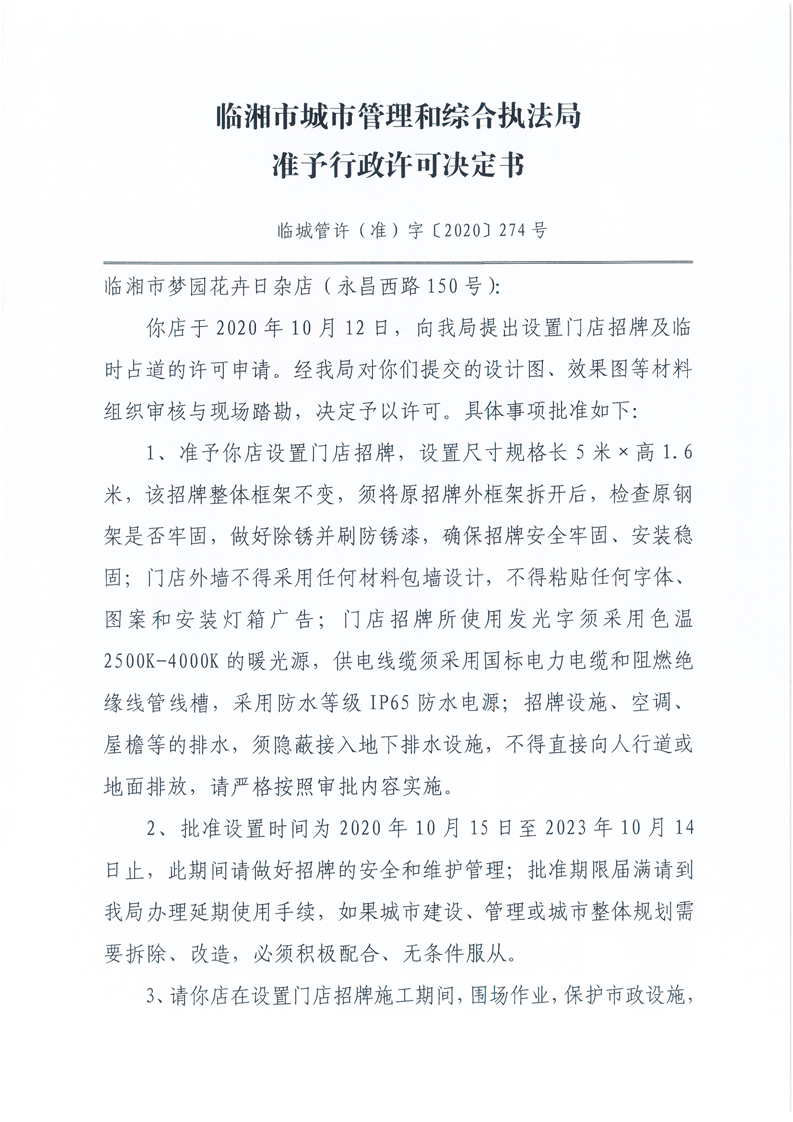 臨湘市夢園花卉日雜店辦理門店招牌設(shè)置許可