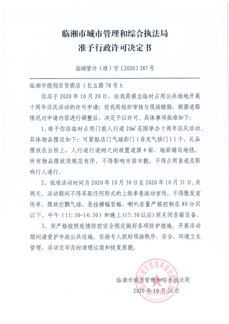臨湘市德翔百貨商店辦理臨時占用街道兩側和公共場地許可
