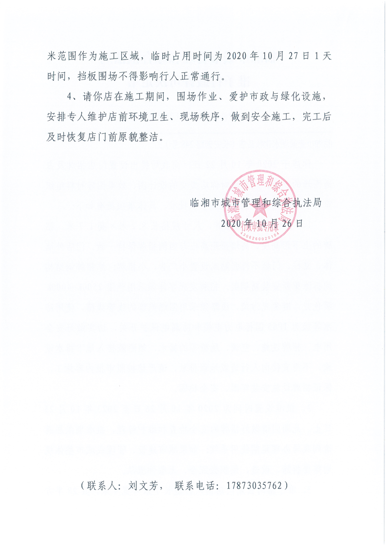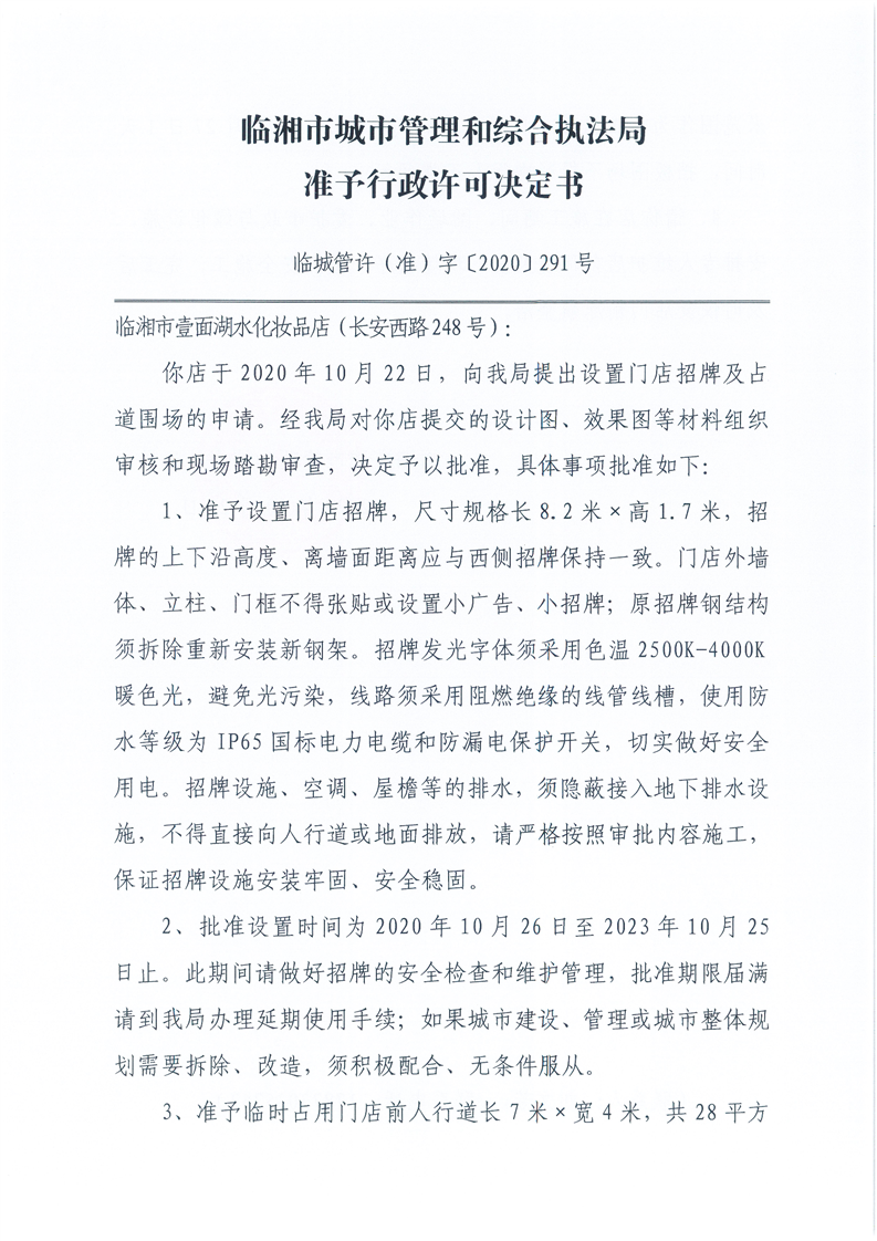 臨湘市壹面湖水化妝品店辦理門店招牌設置、臨時占用城市道路許可