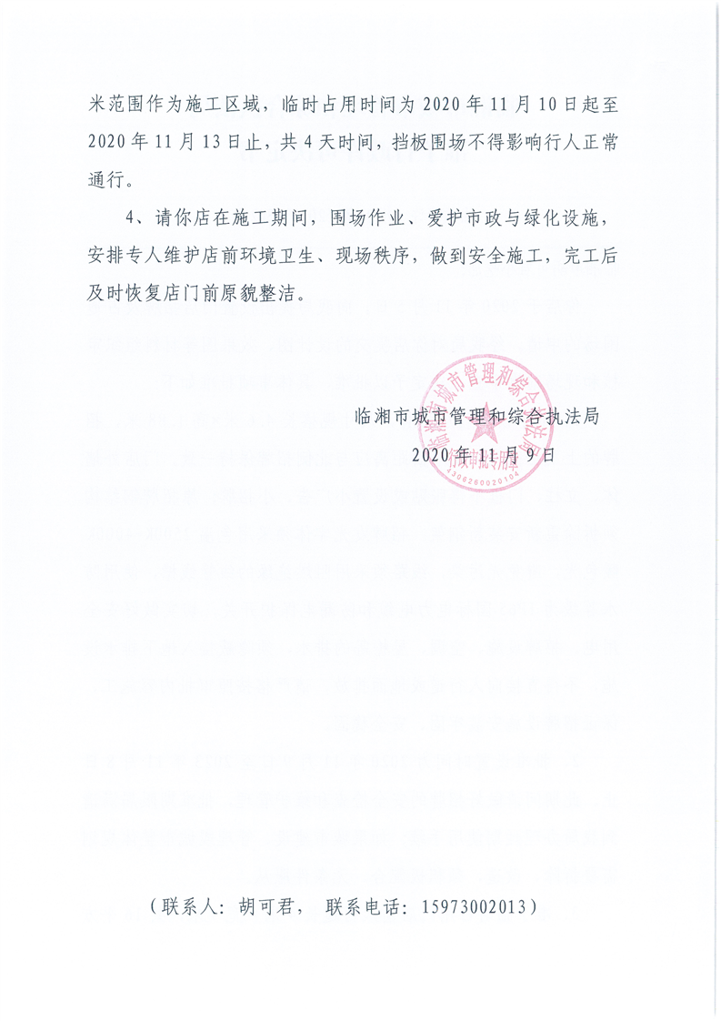 臨湘市胡可君小吃店辦理門店招牌設置、臨時占用城市道路許可