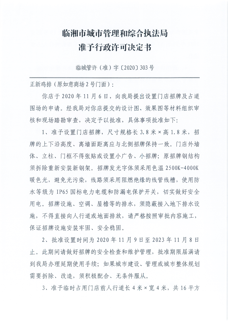 正新雞排(原如意商場2號門面)辦理門店招牌設置、臨時占用城市道路許可