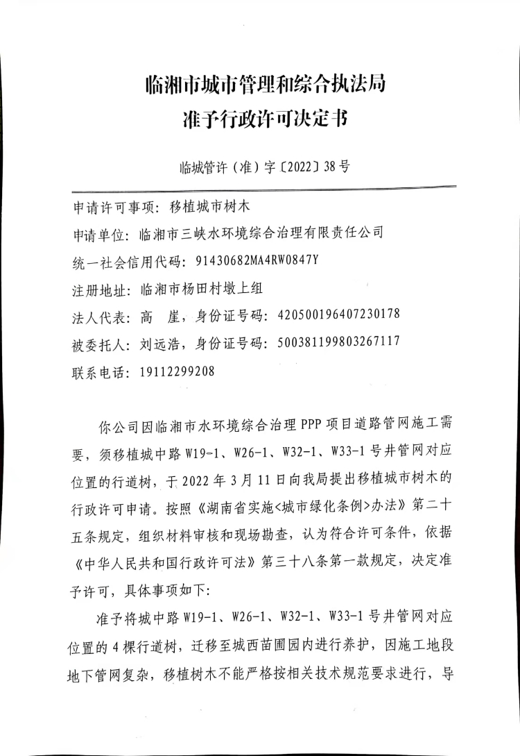 臨湘市三峽水環境綜合治理有限責任公司辦理移栽城市樹木許可