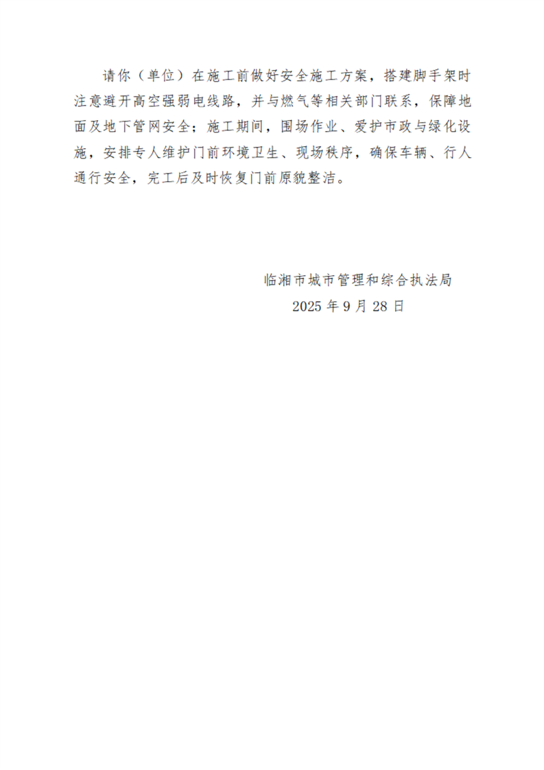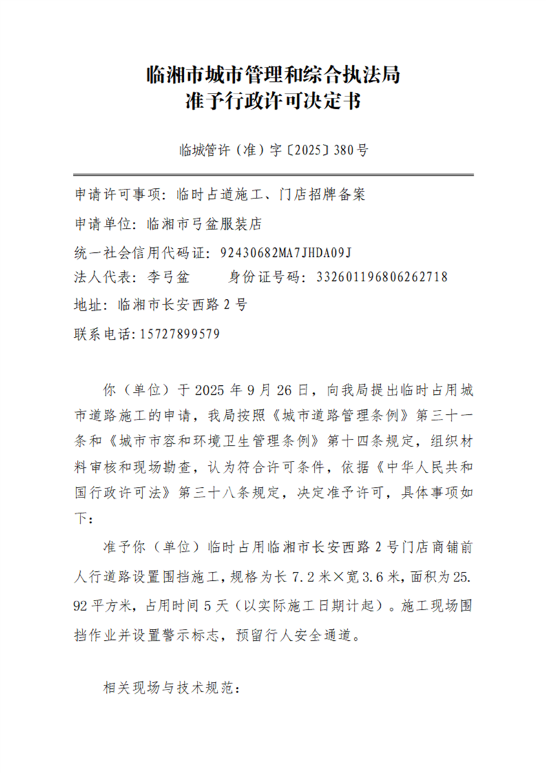 對臨湘市某服裝店臨時占道施工、門店招牌備案的行政許可