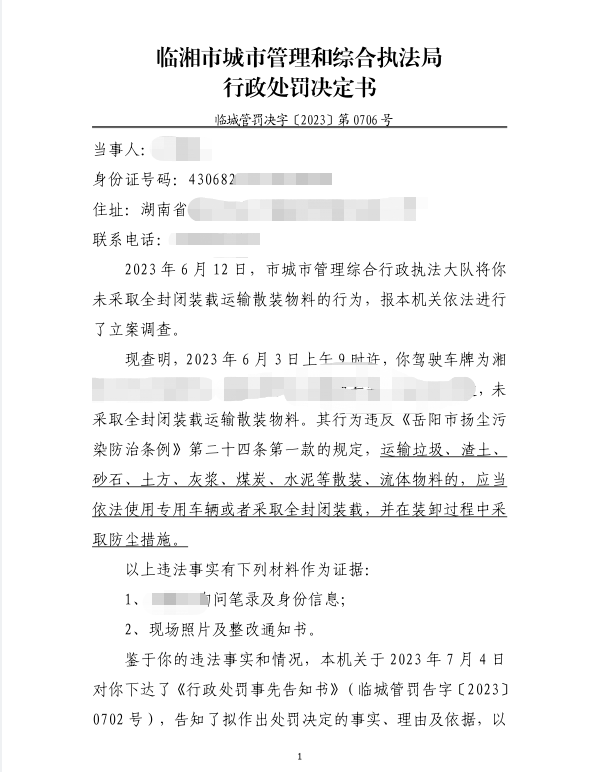 對王某運輸散裝物料未密閉覆蓋的行政處罰